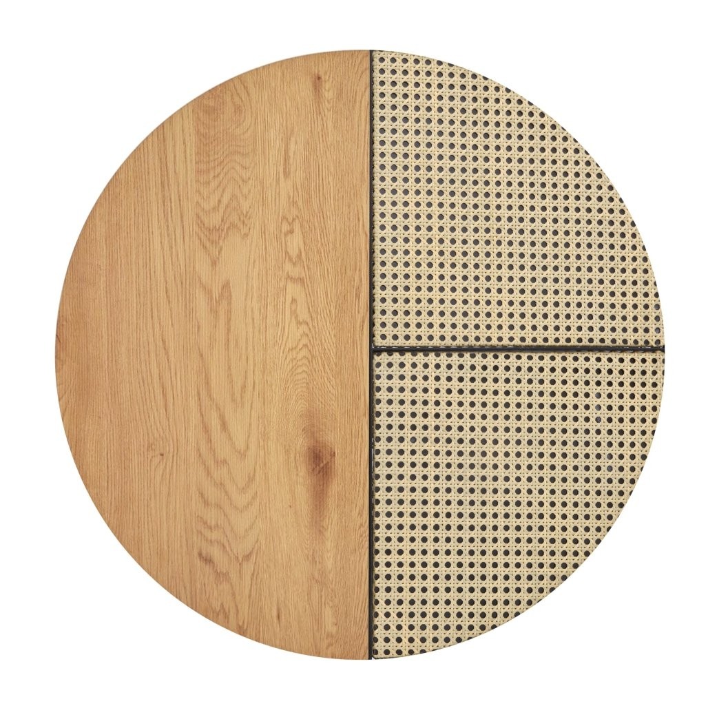 Set dveh klubskih mizic Oranil v stilu z zlato hrastovo površino in črnim kovinskim okvirjem. Praktične in elegantne, primerne za dnevne prostore z industrijskim pridihom.