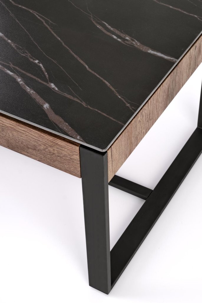 Klubska mizica Orlen s črno marmorno površino in orehovim izgledom prinaša sodoben pridih v vaš prostor in ustvarja čudovit kontrast s črnim kovinskim ogrodjem.