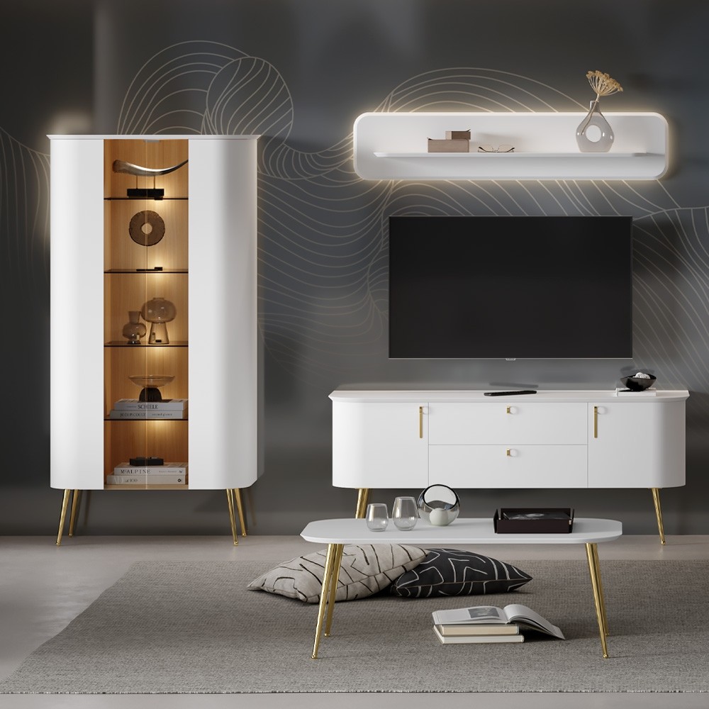 Kolekcija RADDA GALET se ponaša z višjim standardom na področju oblikovanja. Zaobljene linije v kombinaciji z zlatimi detajli prinesejo v vašo dnevno sobo poseben značaj, ki vas bo vsakič znova navdušil. Kolekcija je namenjena vsem, ki želijo v svoj dom vnesti občutek miru in harmonije.
