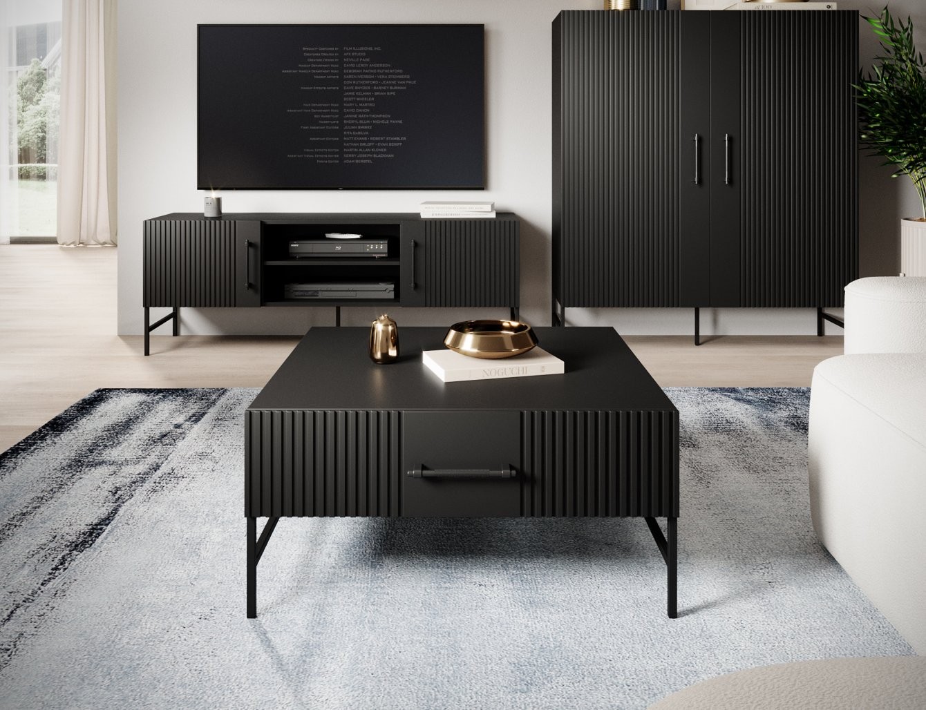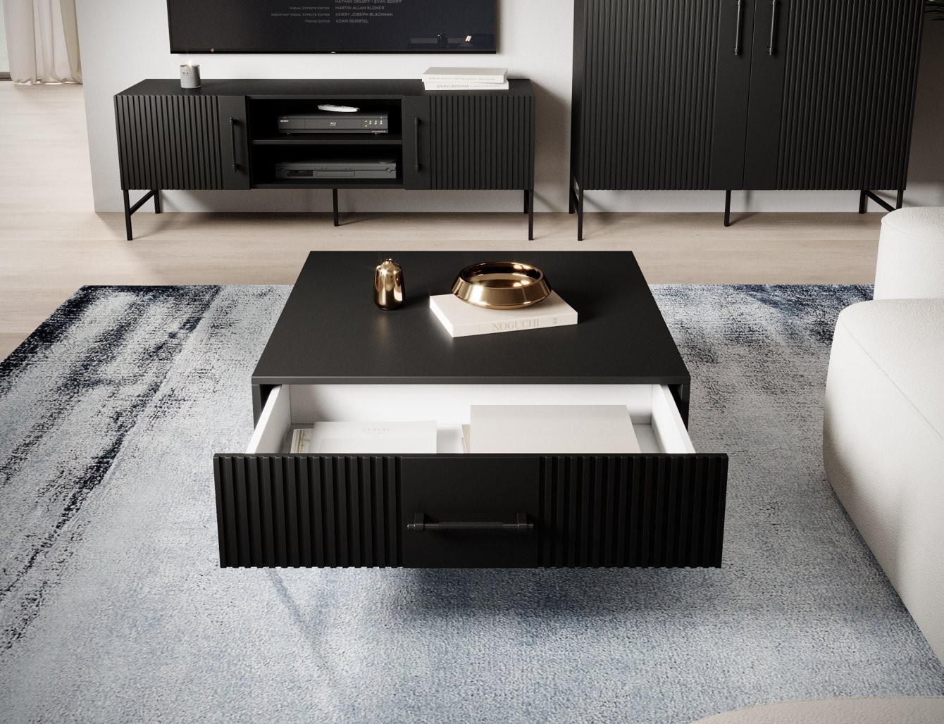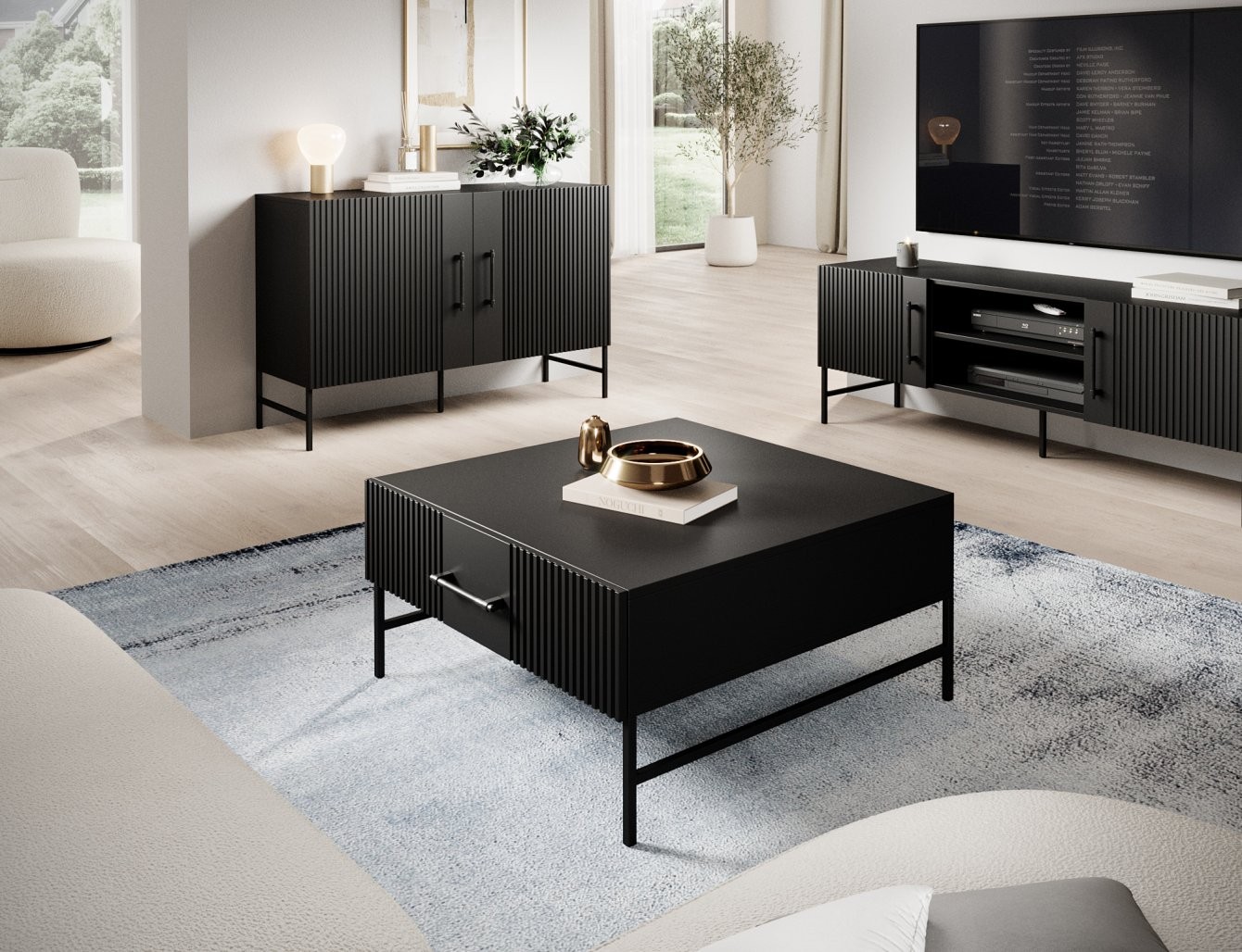 Stabilnost in lahkotnost zagotavljajo črne kovinske noge, prašno lakirane za večjo vzdržljivost, ki se popolnoma zlijejo s celotnim dizajnom. Črni aluminijasti ročaji poudarjajo loft" stil pohištva, predali na vodilih s koleščki pa zagotavljajo gladko in udobno uporabo. Klubska mizica Raftt ni le vizualno privlačna, temveč ponuja tudi praktično rešitev za shranjevanje in organizacijo vašega dnevnega prostora.