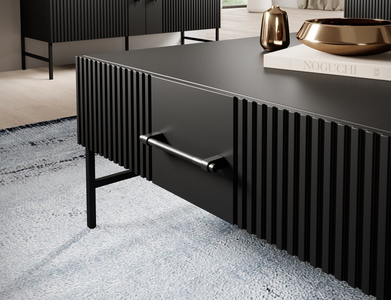 Klubska mizica Raftt iz kolekcije Raftt je popolna kombinacija minimalistične forme in industrijskega sloga, idealna za sodobne interierje. Njena trdna konstrukcija je izdelana iz laminirane iverne plošče, medtem ko rebraste fronte iz folirane MDF plošče dodajo eleganten, surov značaj. Ta univerzalni dizajn se odlično poda v loft, industrijske in moderne ureditve, saj vašemu prostoru doda tako estetiko kot funkcionalnost.