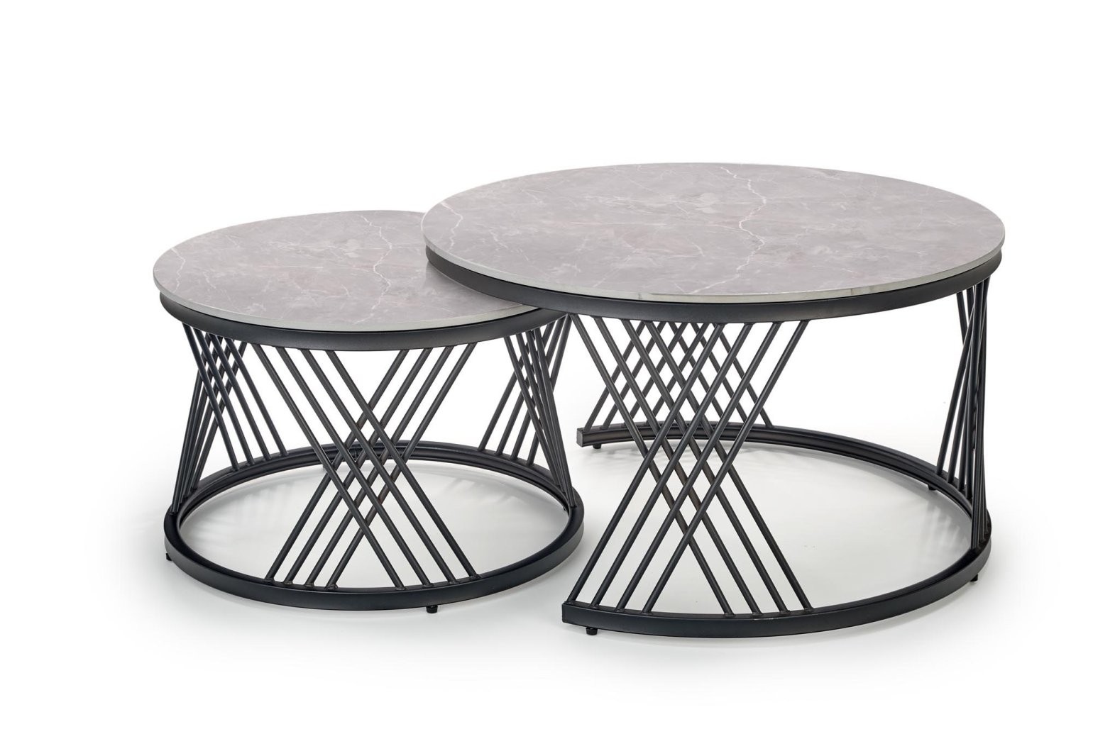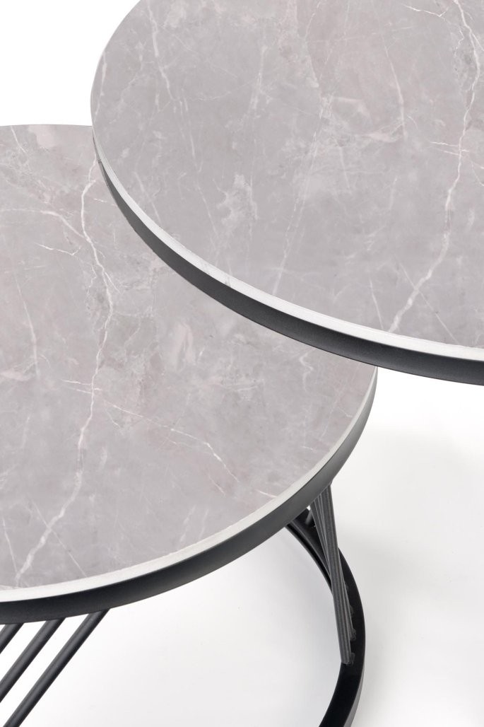Klubska mizica Tilan s sintrano kamnito ploščo v videzu sivega marmorja in črnim kovinskim ogrodjem ponuja trpežnost in eleganco v vsakem prostoru. Priložen je komplet dveh mizic z različnimi višinami, kar omogoča prilagodljivo postavitev in več možnosti za dekoracijo.