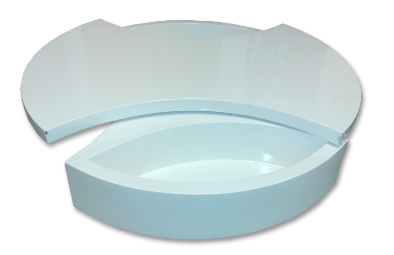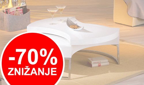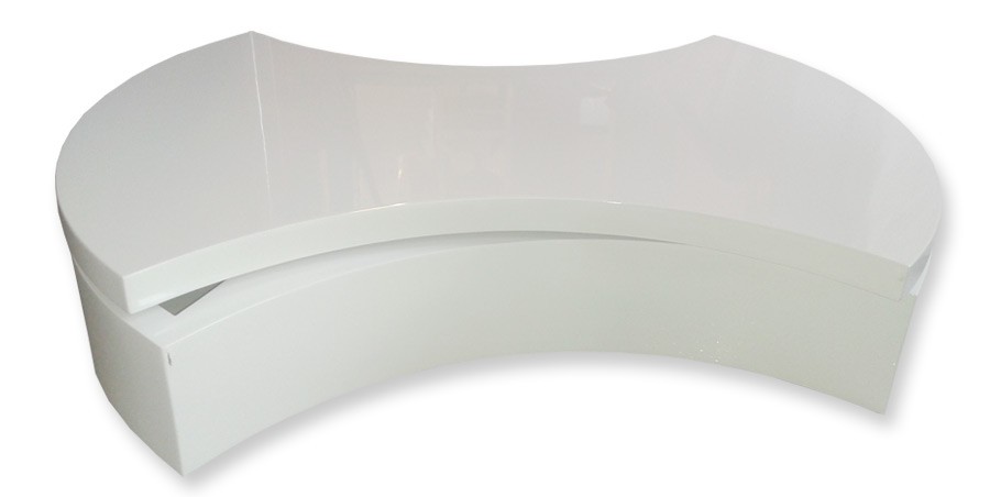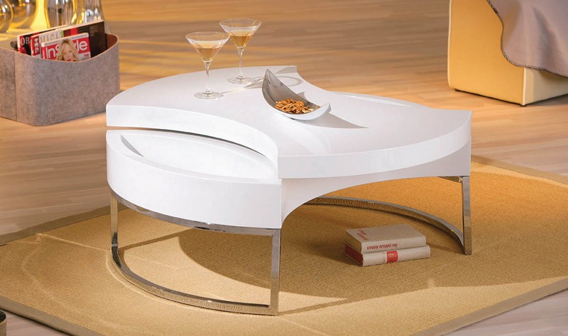 Klubska mizica Turnaround - razstavni eksponat je bele barve (visoki sijaj). Zgornjo ploščo mizice je mogoče preprosto vrteti in s tem spreminjati njeno obliko ter zakrivati in odkrivati predale za shranjevanje predmetov.