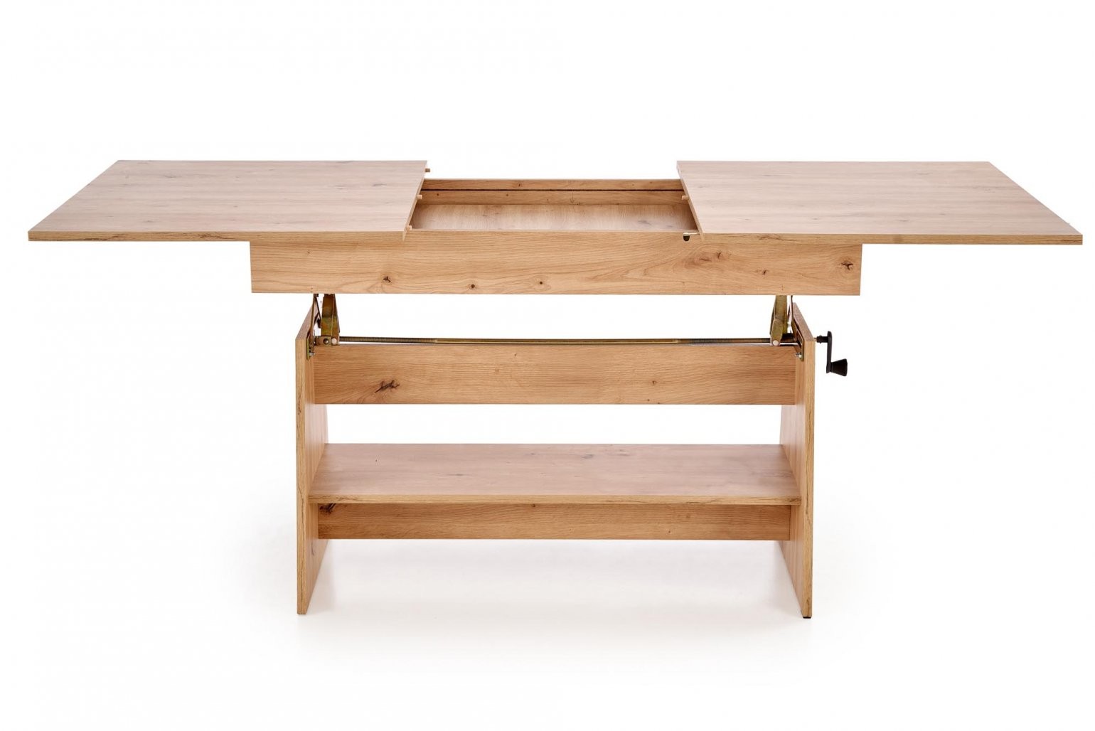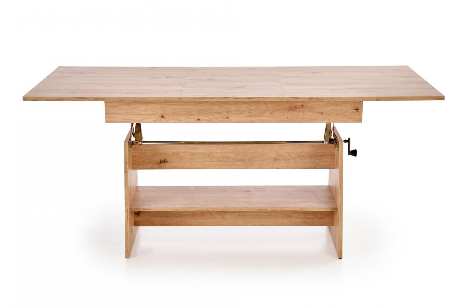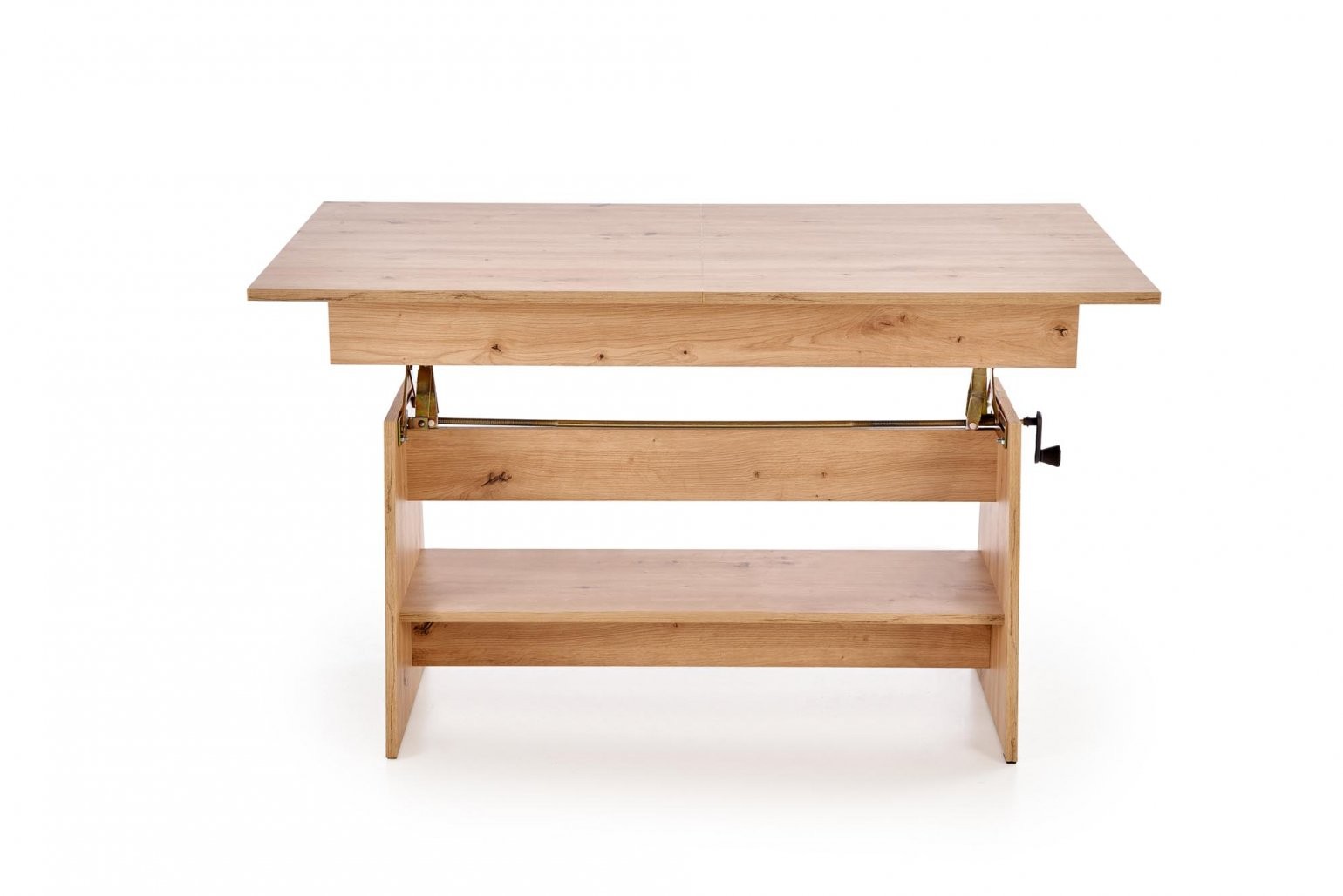 Izdelana je iz kakovostne laminirane iverne plošče, ki zagotavlja trpežnost in dolgotrajno uporabo. Miza je zasnovana kot dvižna in raztegljiva klubska mizica, kar omogoča enostavno prilagajanje velikosti in višine glede na vaše potrebe, ne glede na to, ali potrebujete manjšo mizico za kavo ali večjo površino za druženje.