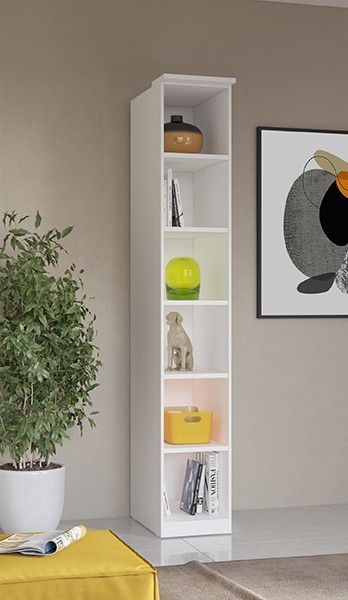 Knjižna omara OPTIMA je na voljo v beli barvi visokega sijaja, ki daje svetlost prostoru. Knjižna omara vsebuje veliko odlagalne površine kamor lahko odložite vaše knjige, revije, časopise in ostale stvari, ki jih želite imeti pospravljene.