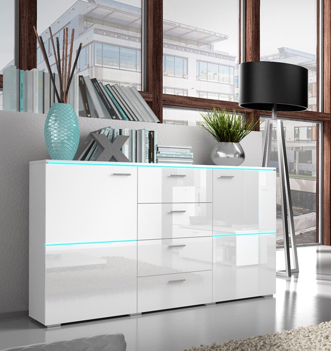 Komoda Anton (bela, visoki sijaj)-z osvetlitvijo