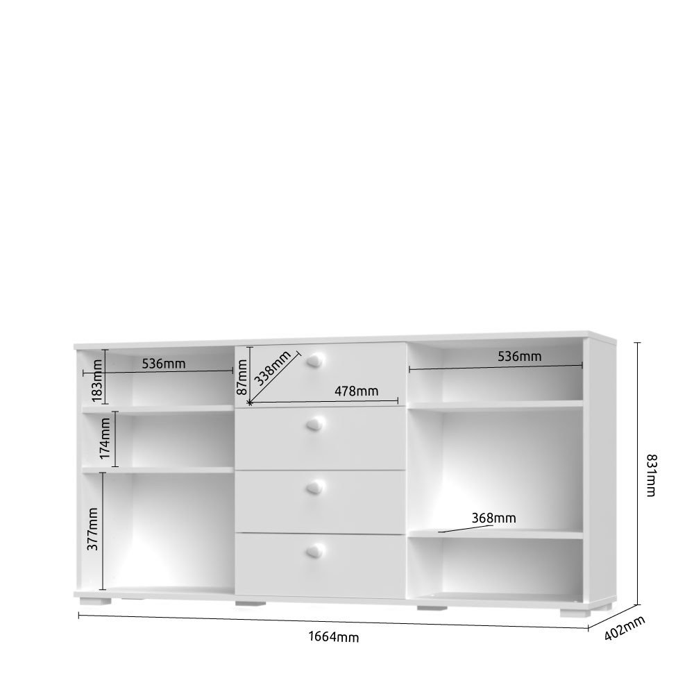 Prostorna široka komoda D7 je idealna za tiste, ki imajo veliko stvari ter si jih želijo organizirati. S to komodo, ki vsebuje 4 predale in dvoja vratca boste lahko organizirali knjige, revije, družabne igre, nakit in ostale predmete po predalih in tako z lahkoto vedno našli to kar iščete.
