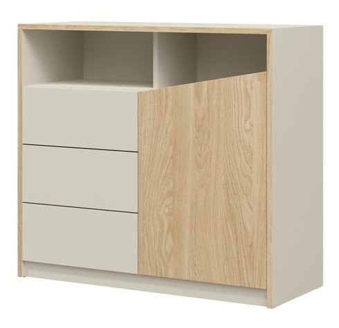 Izdelana je iz kakovostne laminirane plošče debeline 16 mm, kar zagotavlja trpežnost in dolgo življenjsko dobo. Komoda je na voljo v več barvnih kombinacijah in širini, kar omogoča prilagoditev vašim željam in prostoru.