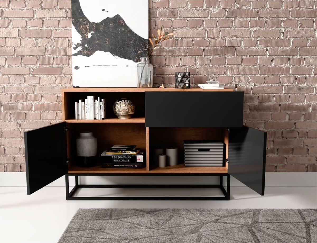 Komoda AVORIO je modernega izgleda in je na voljo v kombinaciji hrasta in črne barve visokega sijaja. Komoda se lahko ponaša z veliko shranjevalnega prostora za vaše družabne igre, knjige in ostale stvari, ki potrebujejo svoj prostor. Komoda vsebuje predal, dvoja vratca in polico.