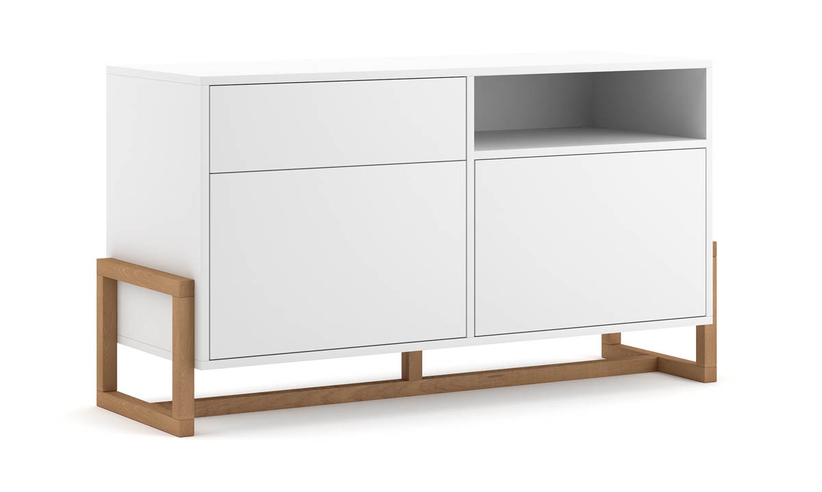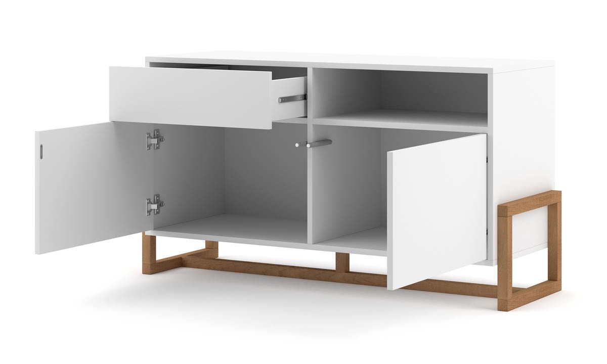 Komoda BENFIK je klasična komoda, ki vsebuje predal, dvoje vrat in polico, kamor lahko shranite vaše družabne igre in nakit, da bo dnevni prostor urejen in čist. Komoda je na voljo v kombinaciji lesa in bele barve.