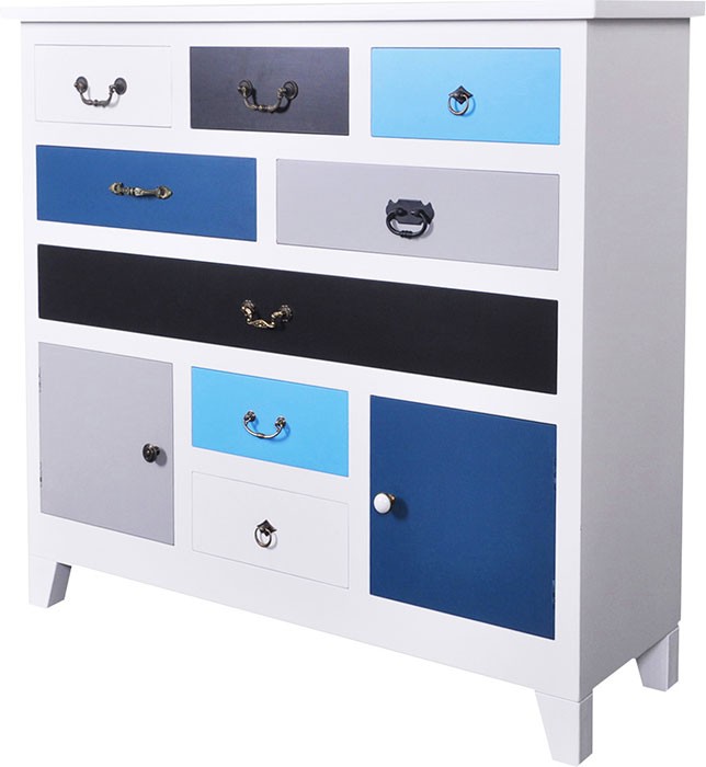 Komoda BLUE 8 je stilska in eleganta komoda. S svojo funkcionalnostjo in dizajnom bo v središču vašega bivalnega prostora. Idealna je za opremo mladega in modernega stanovanja. Moderna komoda je narejena iz trdnega lesa. Njene fronte so pisane in ima 8 predalov in 2 vrata. Maximalna obremenitev je 66 kg.