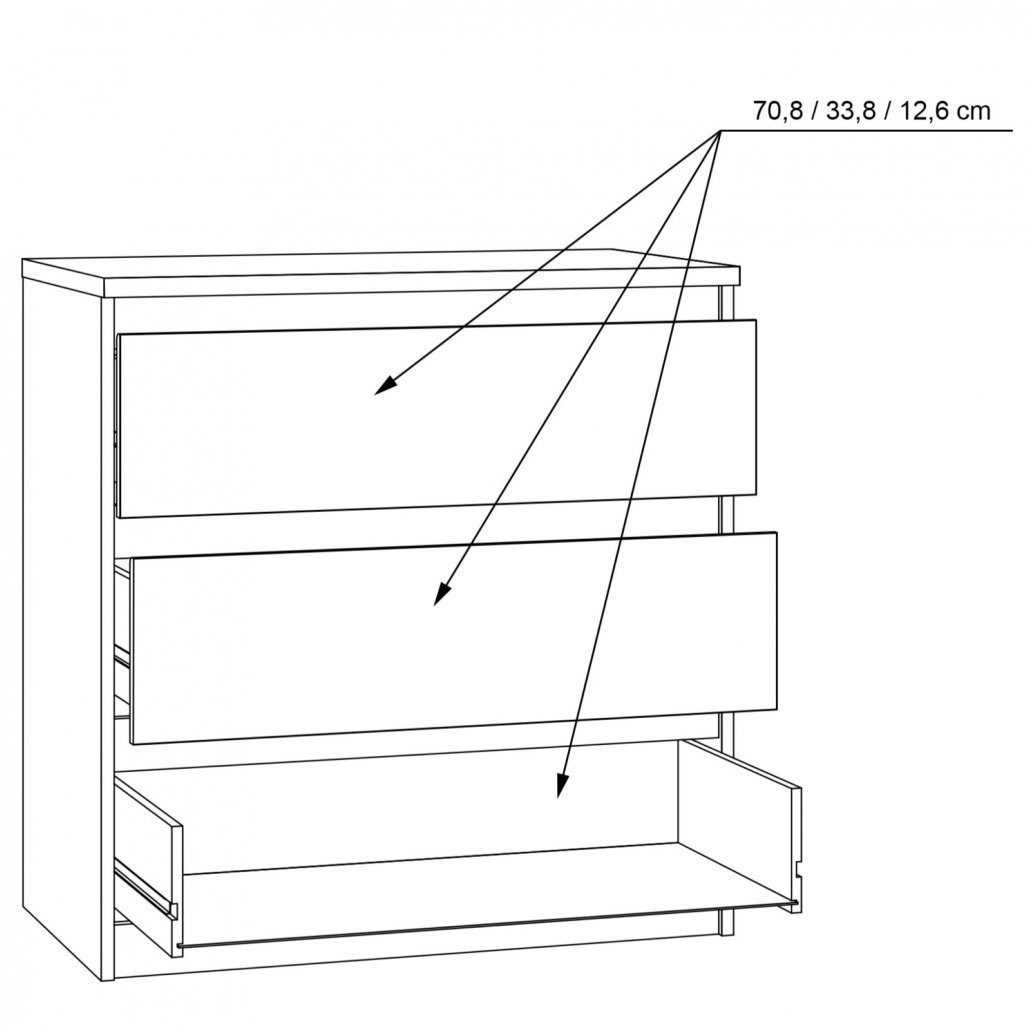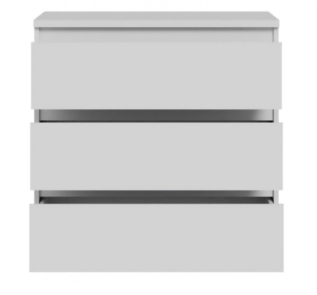 - Funkcionalna komoda s tremi predali brez ročajev, na voljo v mat beli barvi ali v imitaciji hrasta, ki se bo lepo podala v vsak prostor v hiši ali stanovanju.