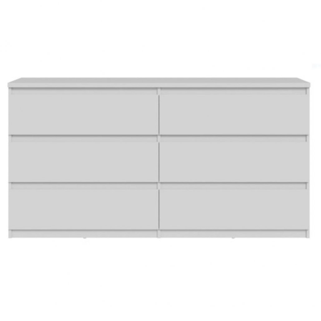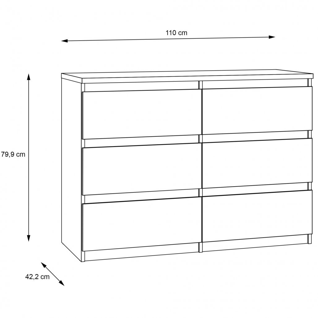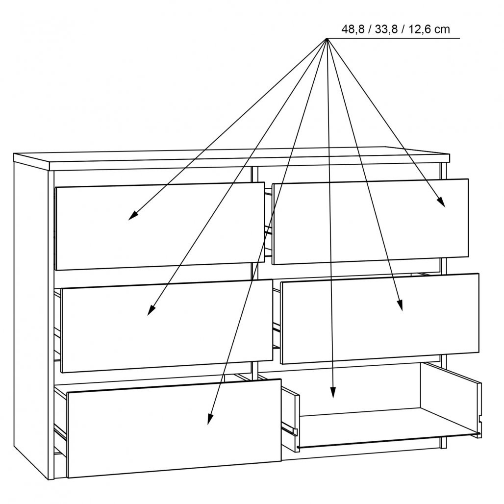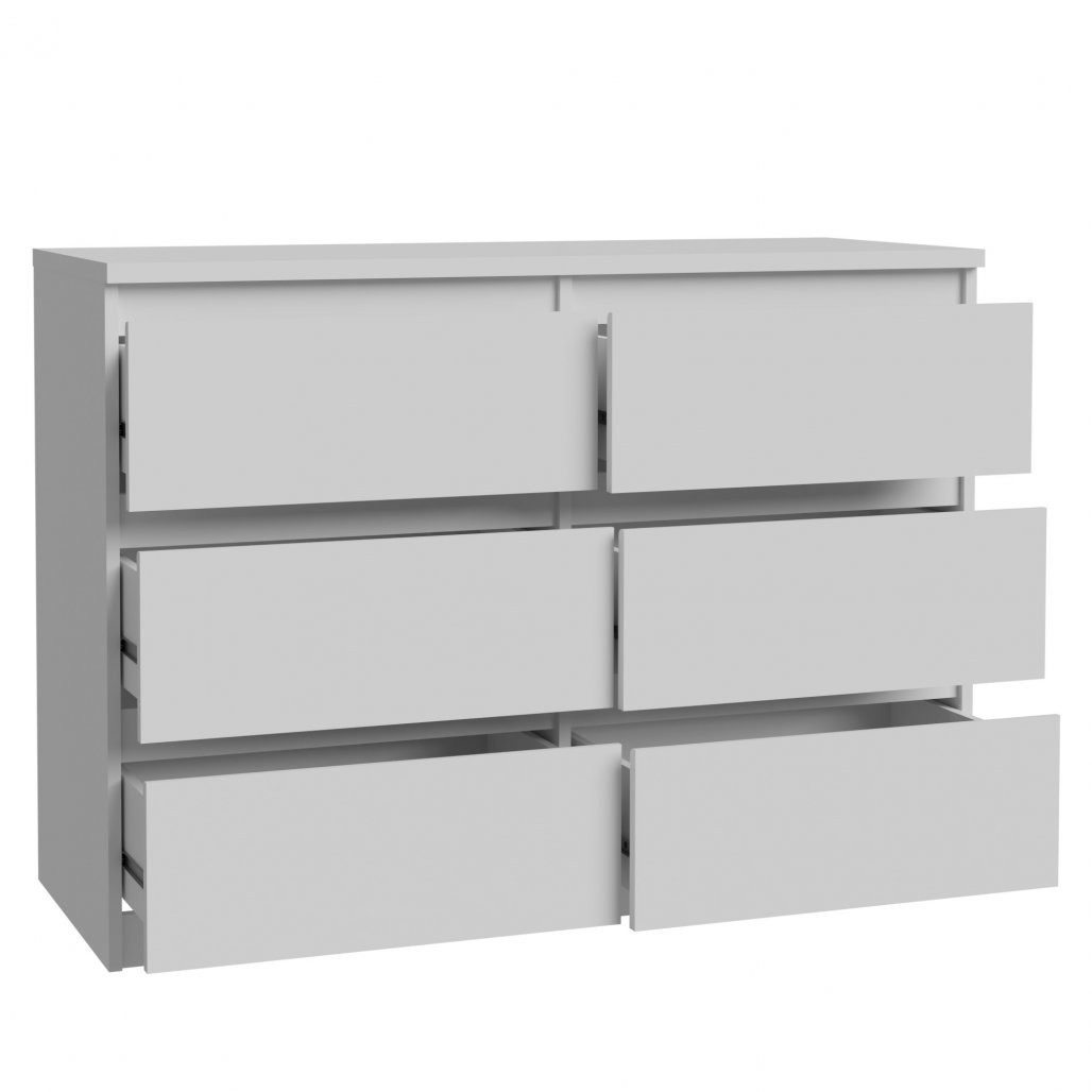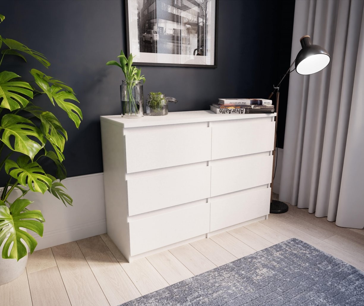 - Velika komoda s šestimi predali brez ročajev, na voljo v mat beli barvi ali v imitaciji hrasta, ki se bo lepo podala v vsak prostor v hiši ali stanovanju.