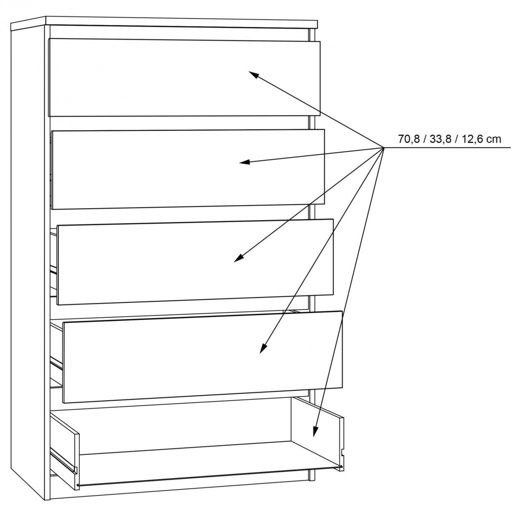 - Visoka komoda s petimi predali brez ročajev, na voljo v povsem beli barvi ali barvi hrasta