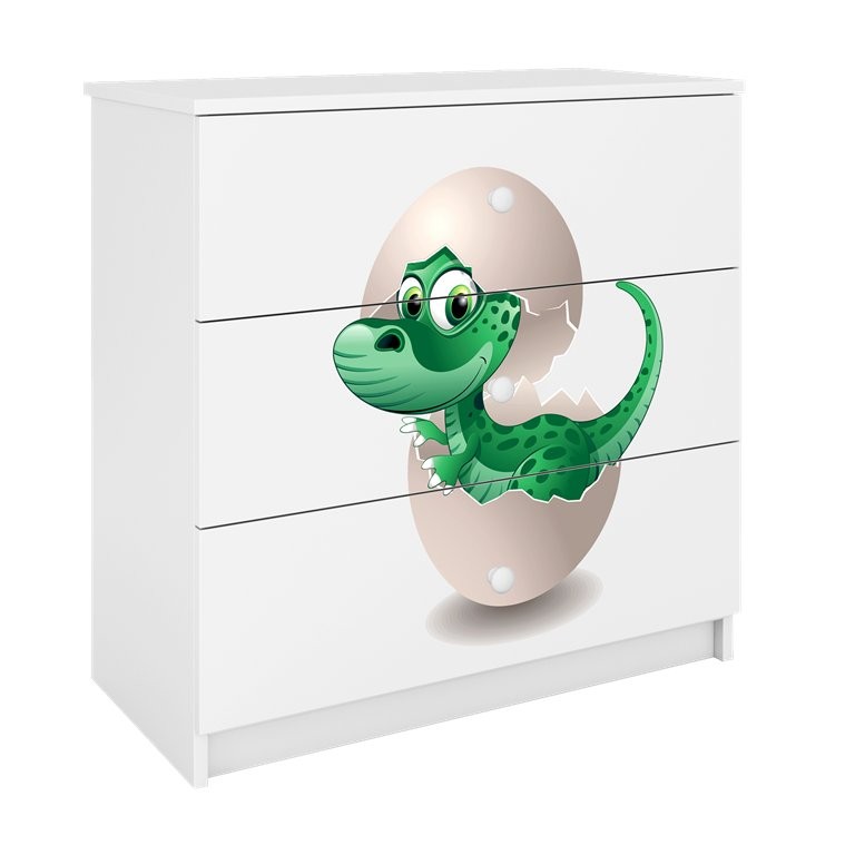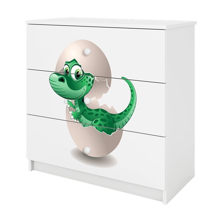 Komoda vključuje tri prostorne predale, ki omogočajo pregledno shranjevanje oblačil, igrač ali drugih vsakodnevnih potrebščin. Predali so nameščeni na kolesnih vodilih, kar omogoča enostavno uporabo pri vsakdanji rabi. Na celotni sprednji površini je nameščen laminiran motiv malega dinozavra, ki dopolni videz izdelka in hkrati pripomore k lažjemu čiščenju površine. Zaradi več barvnih različic je komoda primerna za različne otroške sobe.