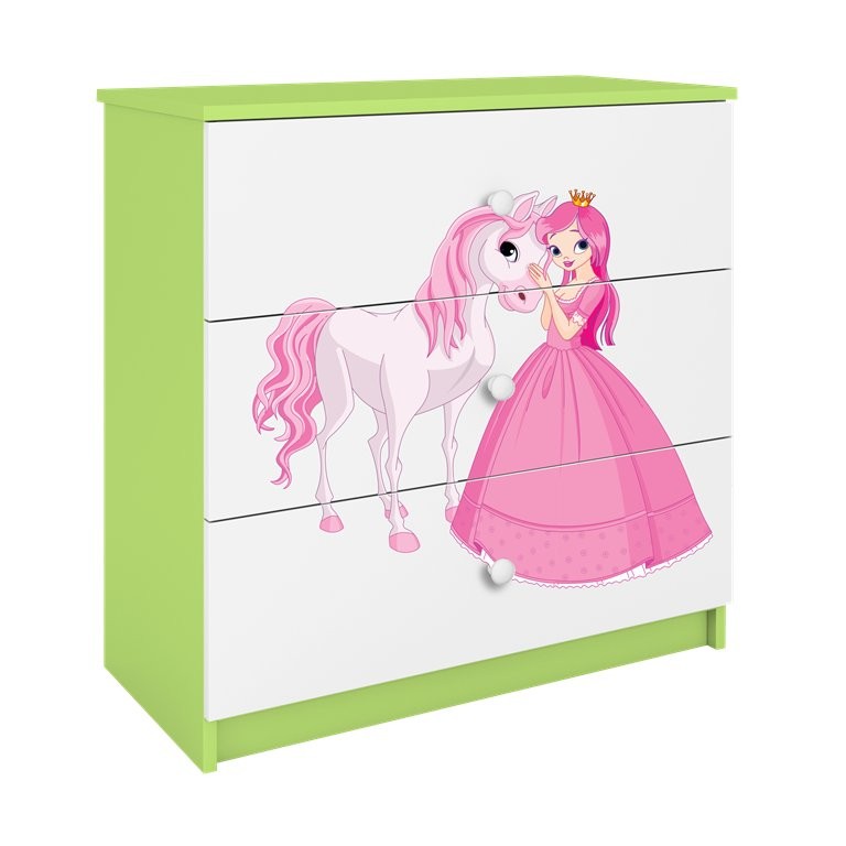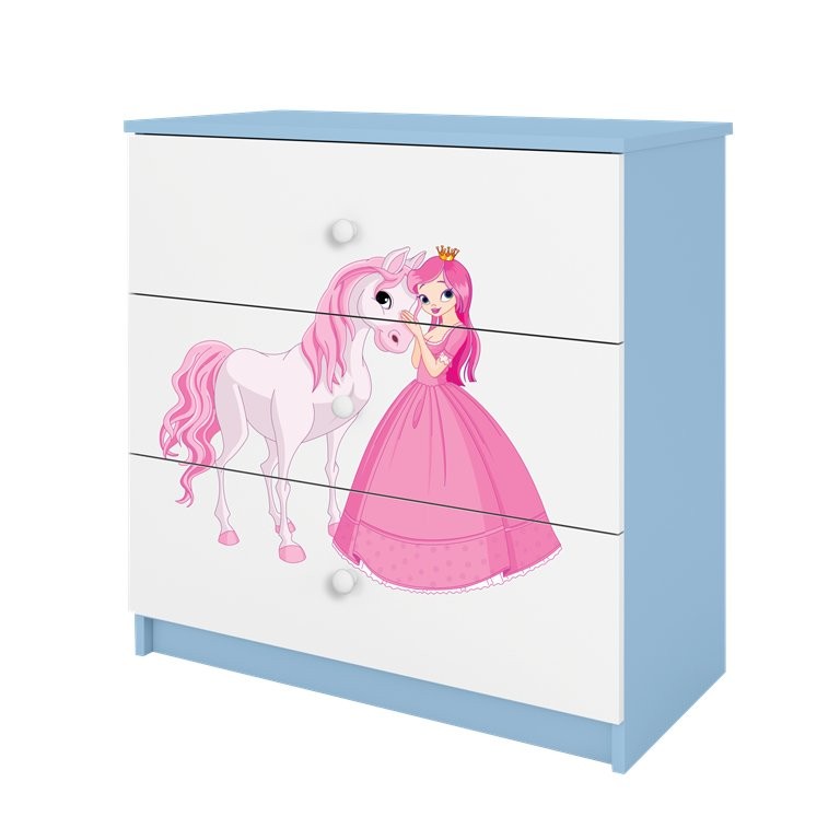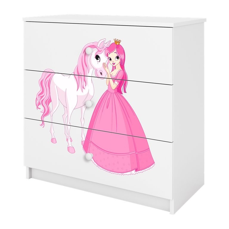 Komoda ima tri prostorne predale, ki pomagajo pri preglednem shranjevanju oblačil, igrač ali drugih potrebščin. Predali so nameščeni na kolesnih vodilih, zato omogočajo enostavno vsakodnevno uporabo. Celotno sprednjo površino dopolnjuje laminiran motiv princeske, ki poudari videz izdelka in obenem prispeva k lažjemu vzdrževanju površine. Zaradi več barvnih različic je komoda primerna za različne ureditve otroške sobe.