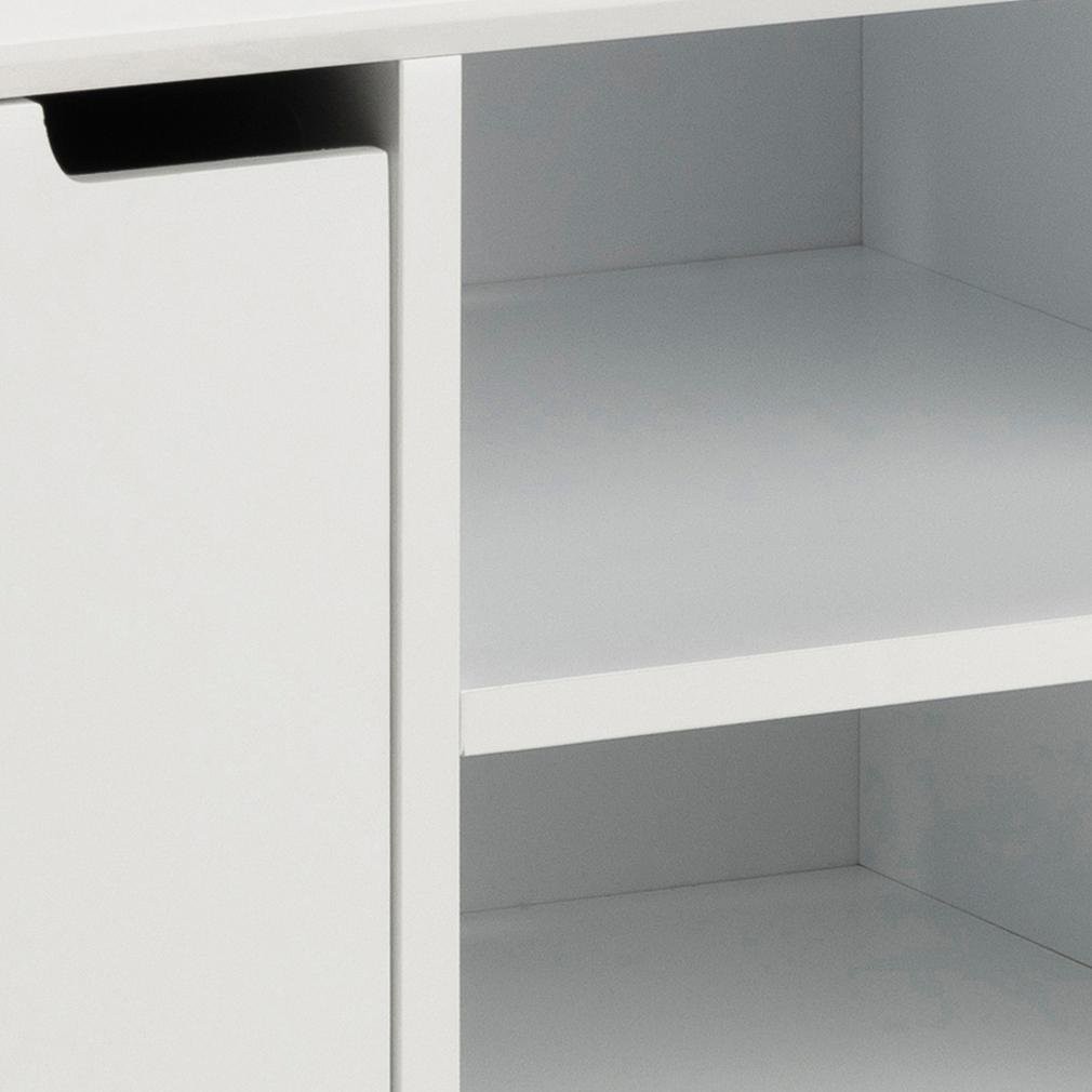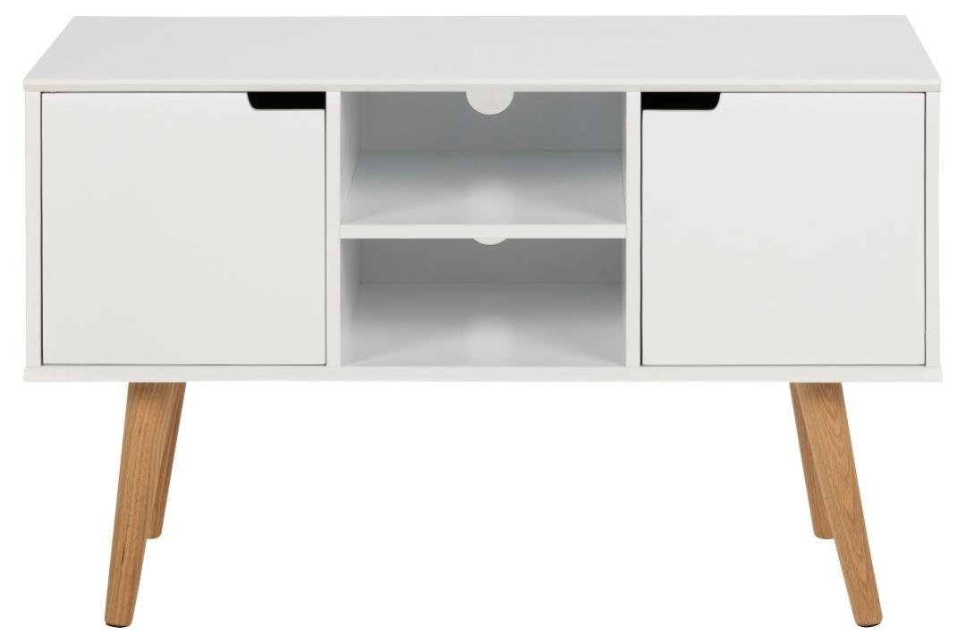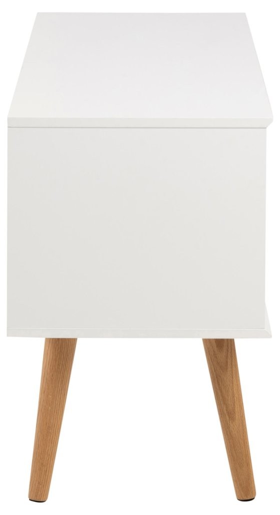 KOMODA HALLOW izraža klasičen nordijski dizajn v beli barvi. Njene posebno oblikovane lesene nogice prinašajo retro pridih. S prostornimi zaprtimi in odprtimi predelki, ki vključujejo tudi možnost urejanja kablov, bo vsaka stvar na svojem mestu. Integrirani ročaji polepšajo estetiko, medtem ko poševne nogice iz hrasta dodajo retro videz.