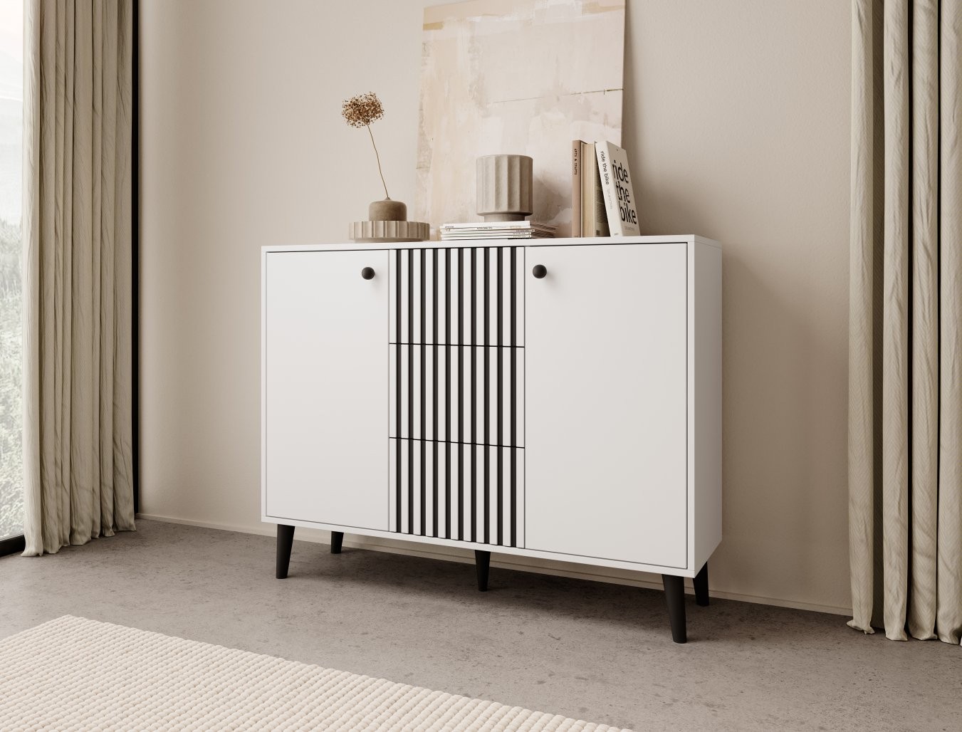Komoda IKA je na voljo v elegantni kombinaciji bele in črne barve, ki se zlahka zlije z različnimi slogi notranje opreme.