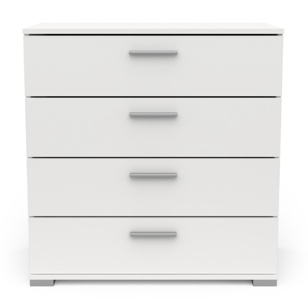 - Na voljo je v mat beli barvi, s štirimi identičnimi predali s kovinskimi vodili in ročaji
