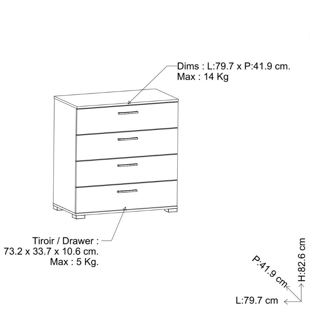 - Maksimalna nosilnost posameznega predala je 5 kg, vrhnja plošča komode pa lahko zdrži do 14 kg