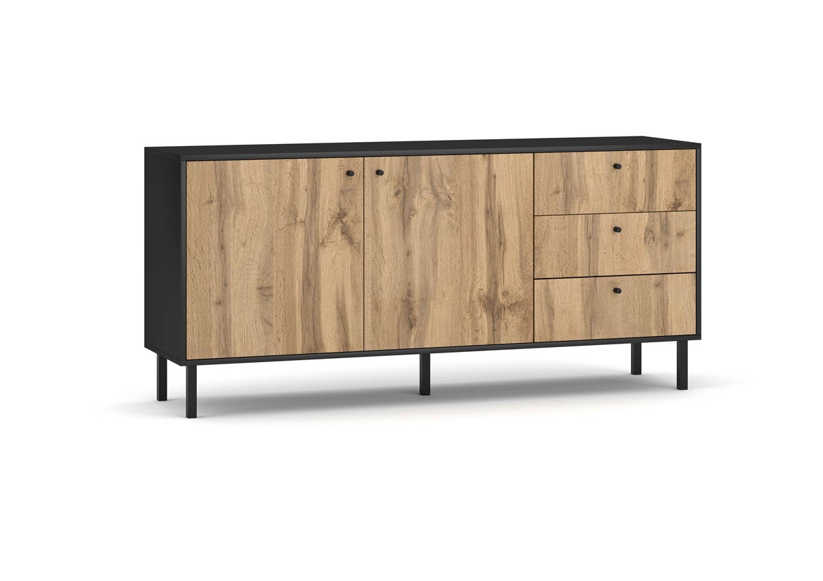 Komoda JATOK in njena čudovita kombinacija artisan hrasta in črne barve bo gotovo poskrbela za vizualno privlačen kontrast v vašem domu. Komoda vsebuje tri predale in dvoja vrata.