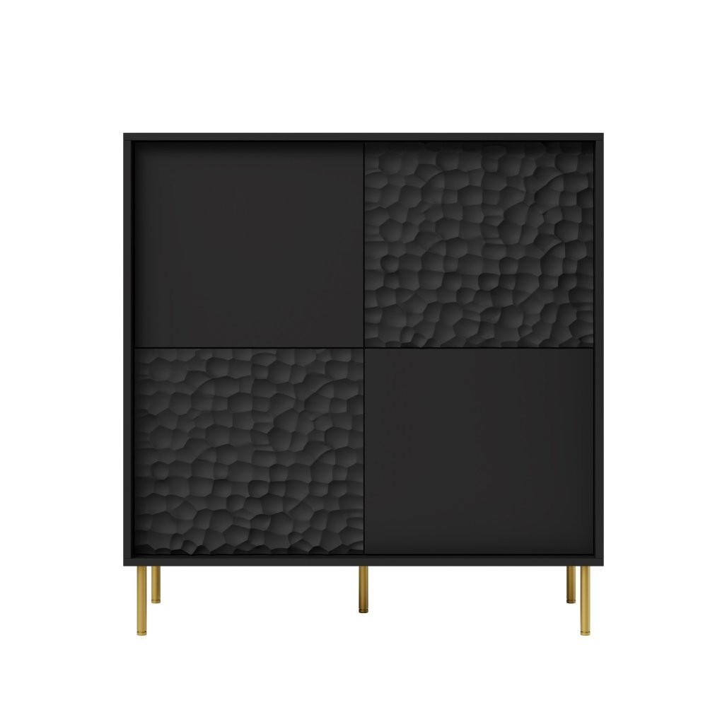 Komoda Jolmar v sodobnem stilu z zlato-črnim okvirjem nudi eleganco in prostornost za shranjevanje oblačil ali dekoracij.