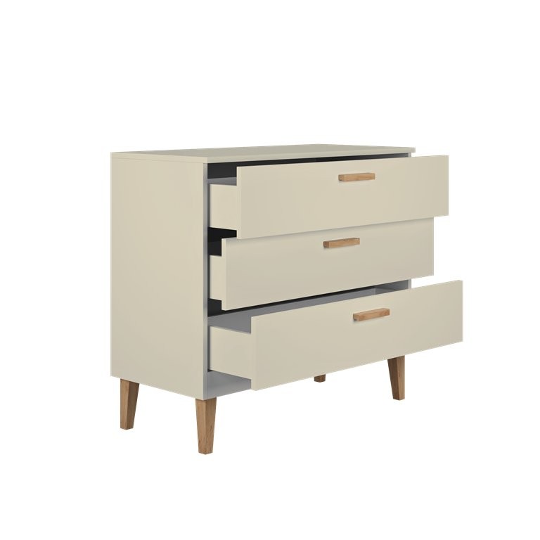 Komoda Kai je praktičen kos otroškega pohištva, ki omogoča urejeno shranjevanje in se s skandinavsko zasnovo lepo poda v otroško sobo. Kašmir barva prispeva k umirjenemu videzu prostora, leseni elementi pa dopolnjujejo celoten videz izdelka. Komoda je zasnovana za vsakodnevno uporabo ter pomaga ohranjati red med oblačili, igračami ali drugimi potrebščinami.