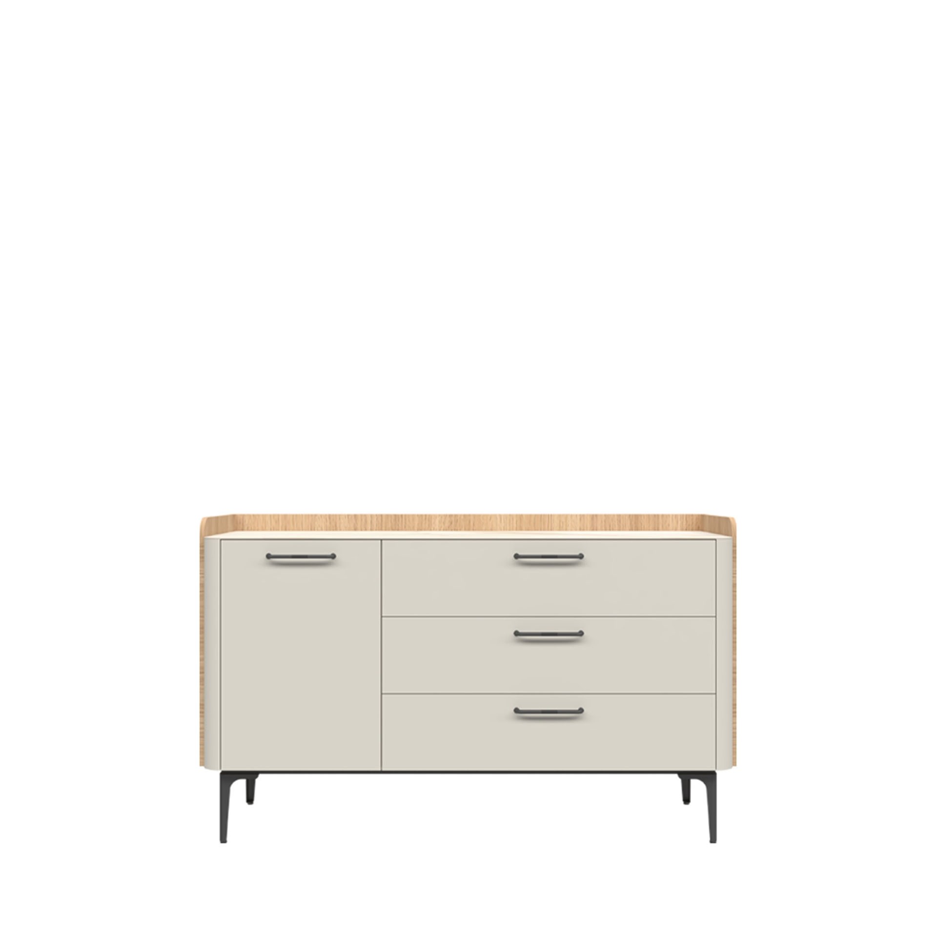 KOMODA KALLA AIR K13/AI je idealna za dodatno shranjevanje, bodisi v spalnici, dnevni sobi ali hodniku. Trije praktični predali ter omarica z vratci nudijo dovolj prostora, dizajn pa sledi celotni vizualni identiteti kolekcije – kombinaciji svetlih front, lesenih tonov in minimalističnih detajlov. Mehanizem za mehko zapiranje je sestavni del vrat in predalov.