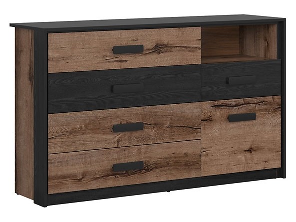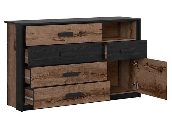 Komoda KASSEL je moderna komoda v kombinaciji samostanskega hrasta in črnega hrasta, ki se odlično podata v moderen prostor. Komoda nudi veliko shranjevalnega prostora, kar vam bo v pomoč pri ohranjanju urejenosti prostora.