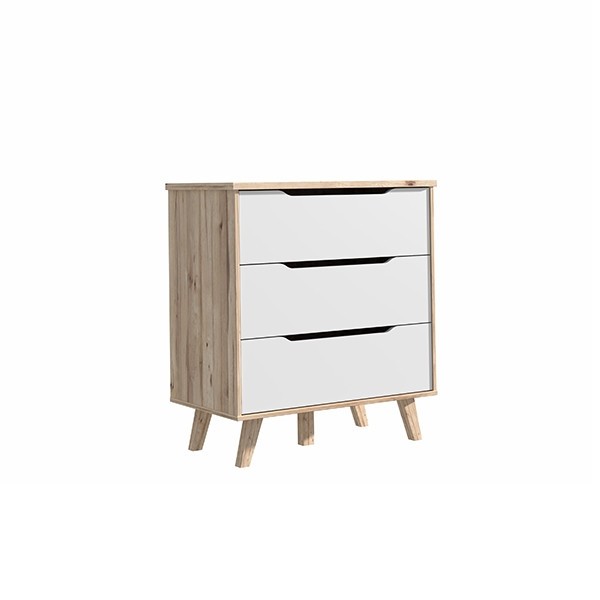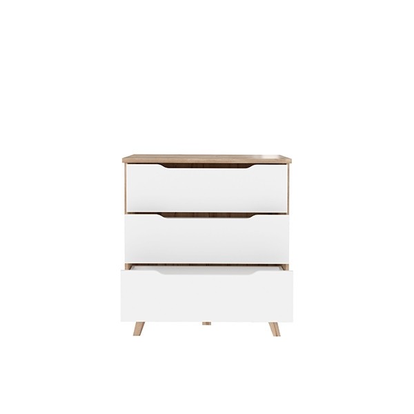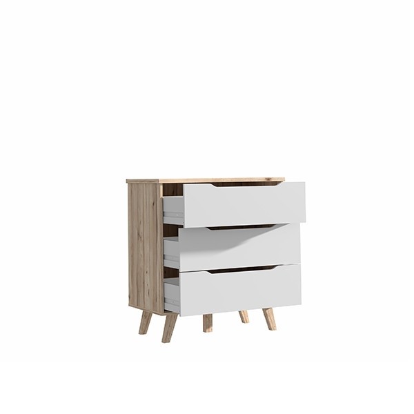 Komoda LALITA je moderna in praktična komoda v sodobnem dizajnu, ki stoji na petih lesenih nogicah. Čudovita kombinacija bele barve in imitacije sonoma hrasta, ter polkrožni izrezi namesto ročajov dajejo tej komodi moderen in minimalističen izgled, ki se odlično poda v vsako sobo. Oglejte si še ostale elemente iz istega programa!