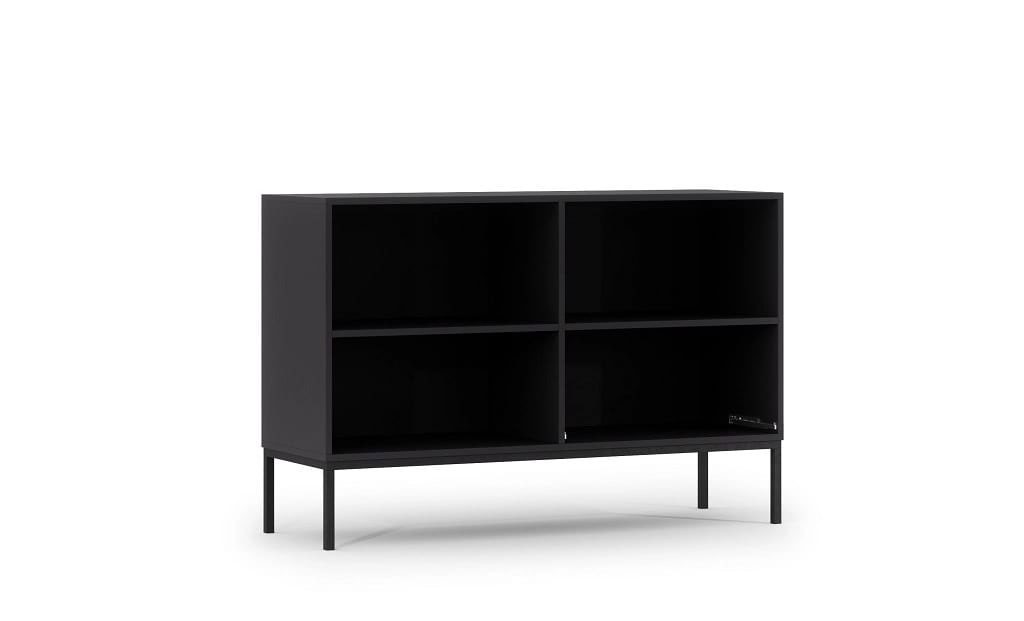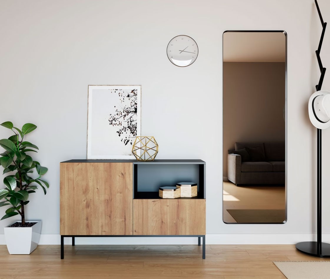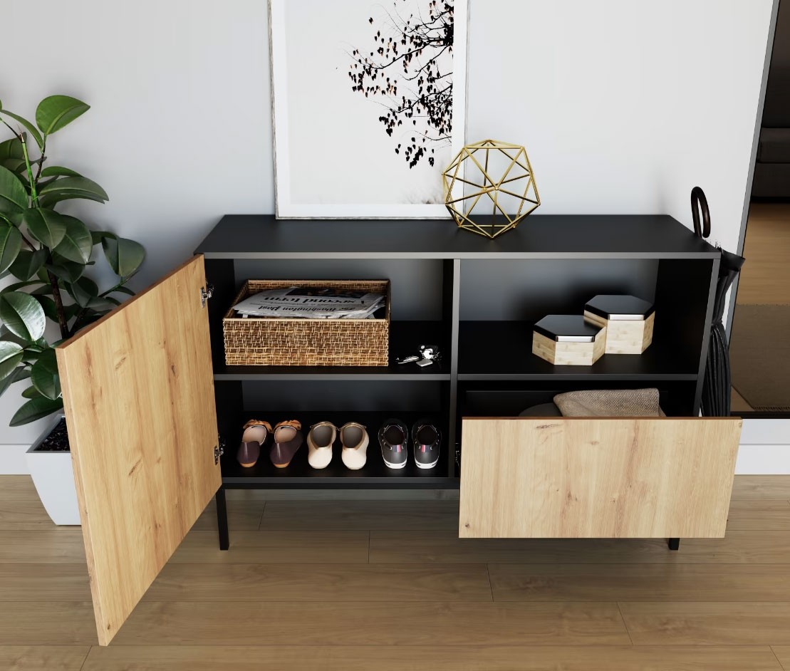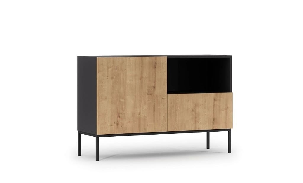 Preprosta in praktična komoda LANZZI je na voljo v kombinaciji hrasta in mat črne barve, ki v prostor prinese pridih modernega stila. Komoda nudi polico, predal in vratca, kar pomeni, da nudi veliko shranjevalnega prostora, ki omogoča urejen izgled dnevne sobe.