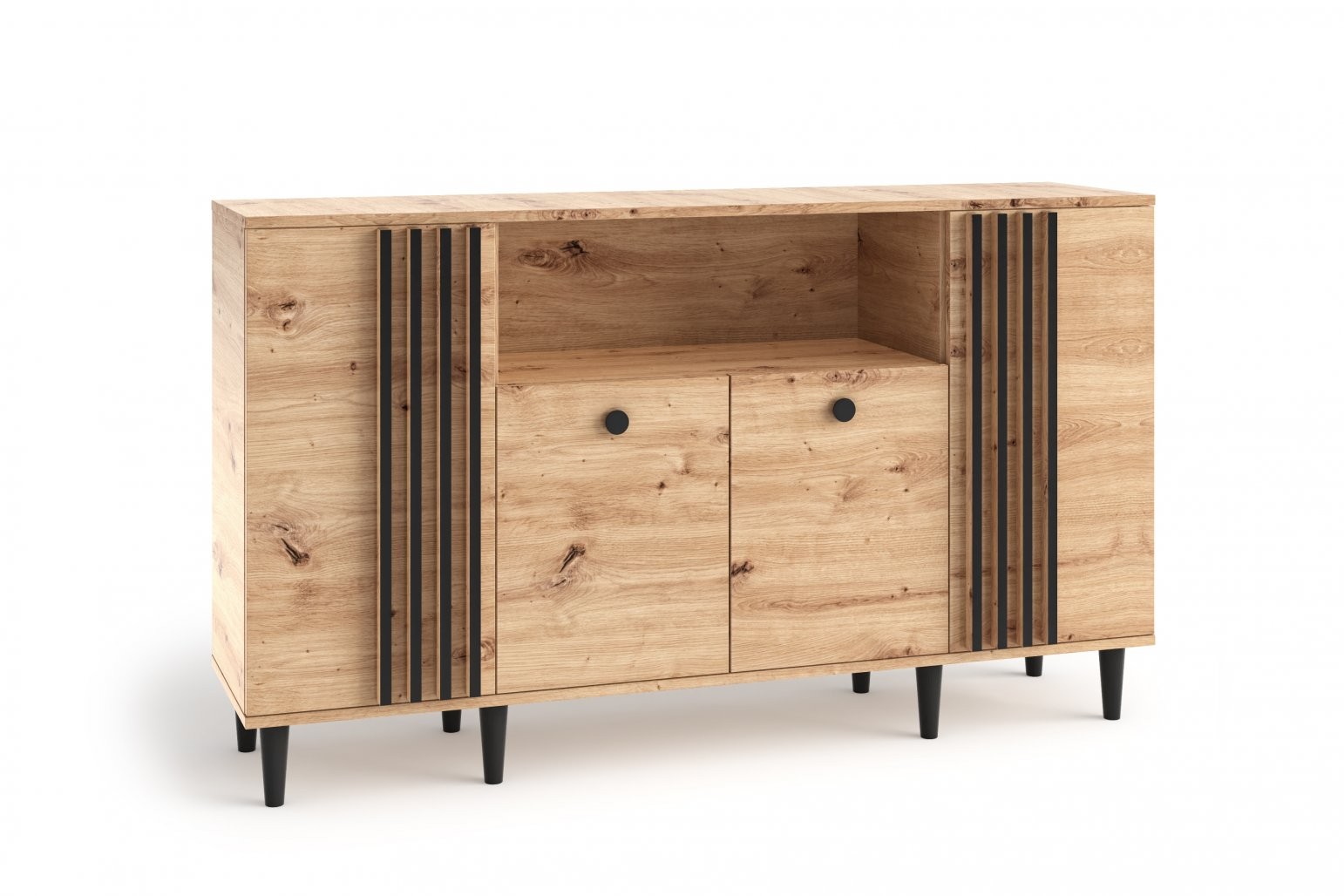 Komoda LIVIA 04 je elegantna in funkcionalna izbira za vašo dnevno sobo, spalnico ali pisarno. Zasnovana je v sodobnem slogu, ki združuje toplino naravnega videza hrasta z modernimi črnimi detajli, kar ustvarja privlačen kontrast in izjemno estetiko.