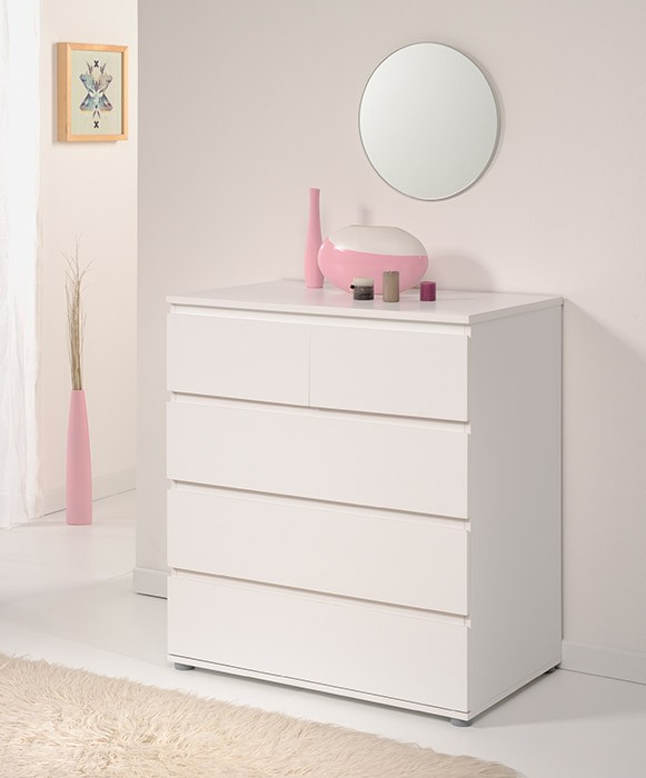 Komoda Neo 5 je na voljo v beli in wenge barvi. Komoda ima 5 predalov.
