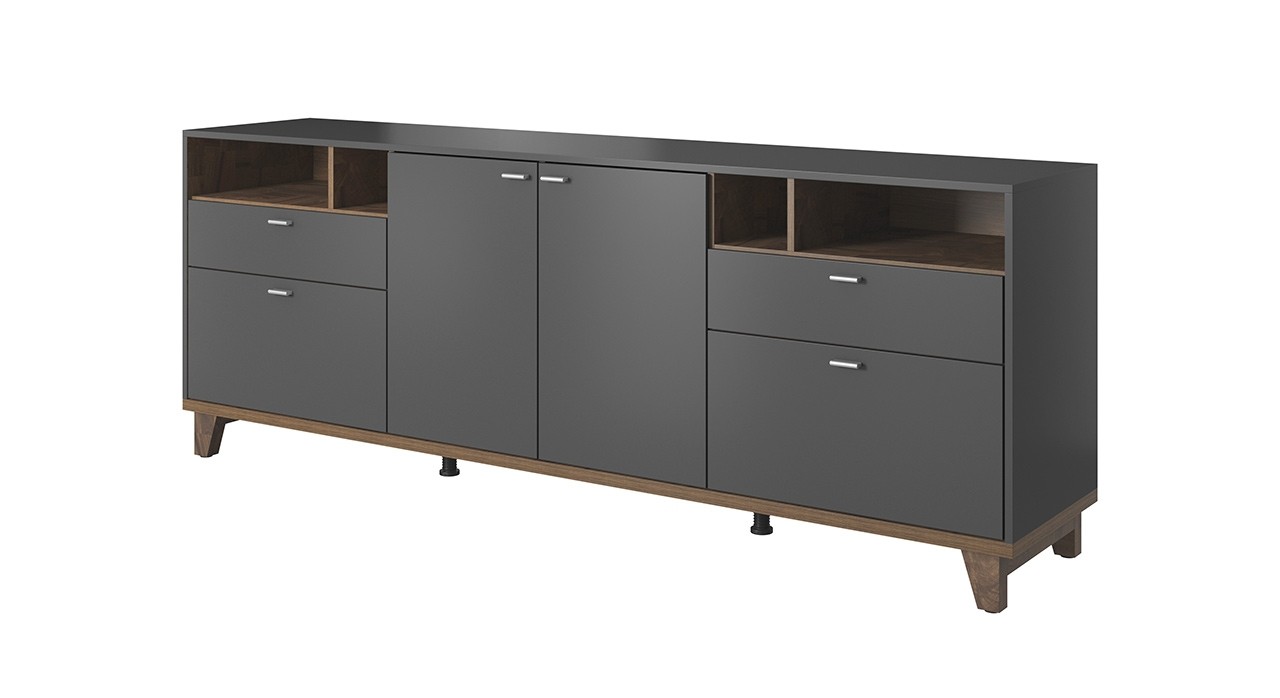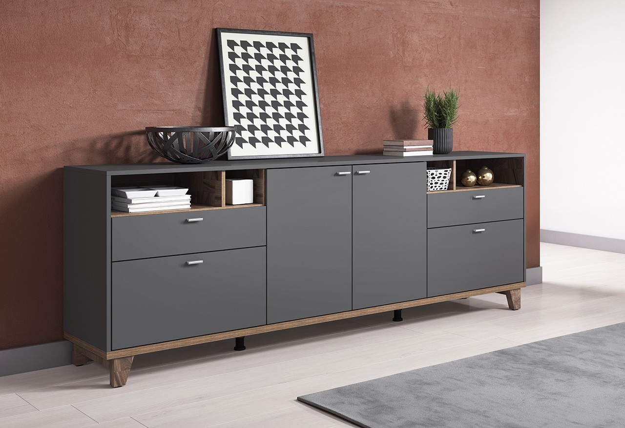 Opremite svojo dnevno sobo, jedilnico ali predsobo z izjemno funkcionalno komodo OSLO, ki nudi obilo prostora za shranjevanje. Omarica je razdeljena na 4 manjše omarice, 2 predala in 4 odprte police, zato nudi odlično organizacijo revij, knjig, DVDjev, družabnih iger in ostalih malenkosti katere želite imeti lepo pospravljene.