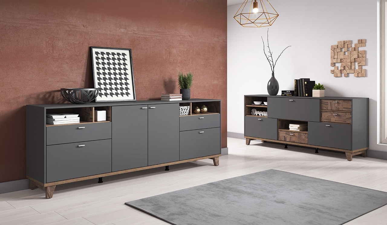 Kolekcija OSLO se odlikuje po velikem številu manjših omaric, predalov in polic, ki vam olajšajo ohranjanje reda in čistoče v dnevni sobi. Omogoča izjemno dobro organizacijo najrazličnejših predmetov, zato boste vedno vedeli, kje je kakšna stvar pospravljena.