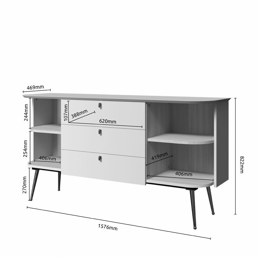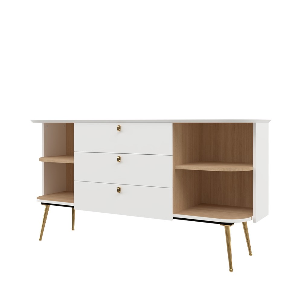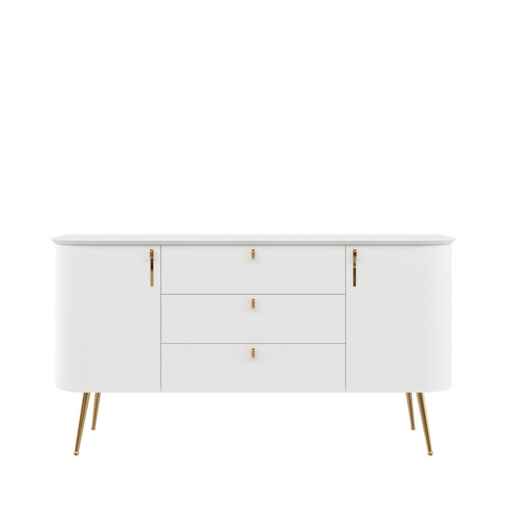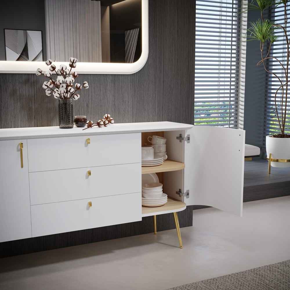 Komoda RADDA GALET s tremi predali in dvojnimi vrati nudi praktično in pregledno shranjevanje za vsakodnevno uporabo. Zlate ročke, visoke nogice in diskretne zaobljene linije ji dajejo eleganten videz, medtem ko mehanizem mehkega zapiranja omogoča tiho zapiranje predalov in vrat. Popolna kombinacija oblike in uporabnosti dvigne celoten interier vaše dnevne sobe na višjo raven.