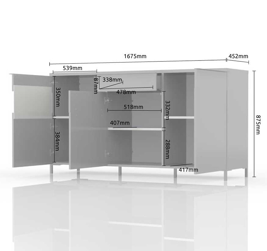 Komoda je na vseh zunanjih delih premazana z UV lakom, ki ustvari visoki sijaj. Visoki sijaj nudi pohištvu bolj eleganten in prefinjen videz, zato bo vaša dnevna soba vedno izgledala odlično in bo v središču pozornosti.