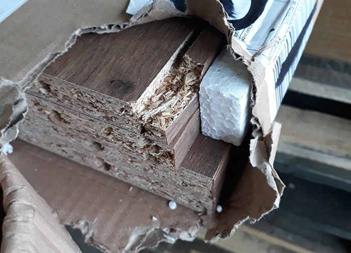 Komoda ima na elementu (hrbtišče) manjšo poškodbo, ki ne bo vidna, ko se komoda sestavi. Slika poškodbe v galeriji.
