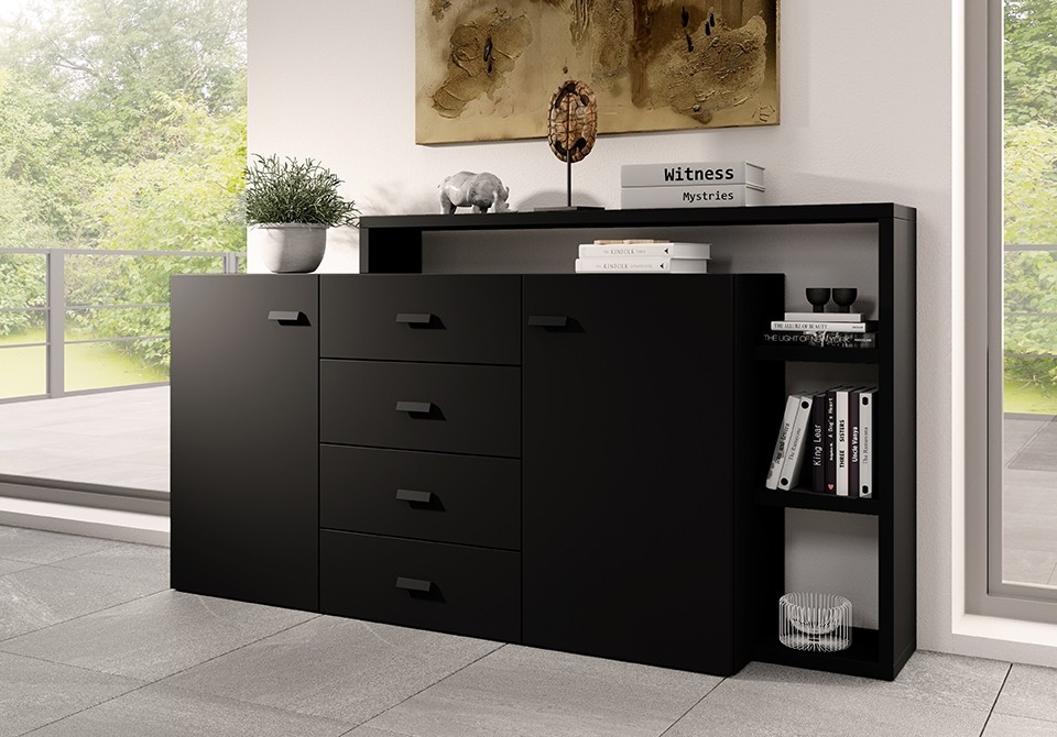 Komoda s knjižnimi policami je modernega izgleda in zelo praktična. Komodo lahko uporabljate za shranjevanje vaših električnih naprav medtem, ko pa police lahko služijo za odlaganje knjig ali revij, ki jih radi prebirate. Na voljo je v črni supermat barvi.