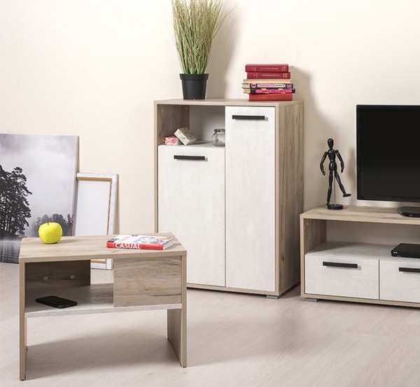 Komoda SILVIE 1 bo zagotovo popestrila vaš dom. Moderna komoda v kombinaciji bele barve in hrasta ima dve različno veliki omarici, ki se odpirata s stilskim, kovinskim ročajem. Obe omarici imata eno polico, kateri lahko prilagodite višino za maksimalen izkoristek prostora! Zaradi njenega univerzalnega in modernega izgleda jo lahko uporabite v vseh sobah vašega doma.