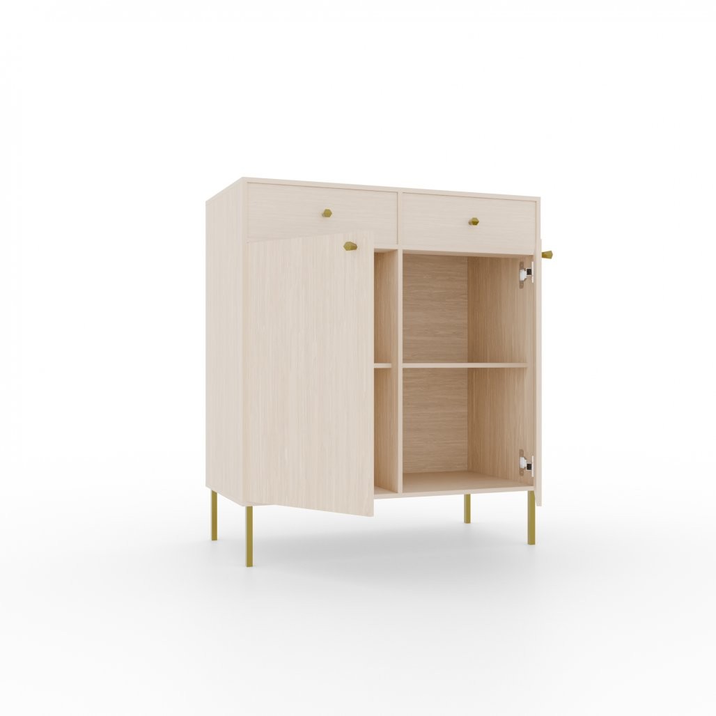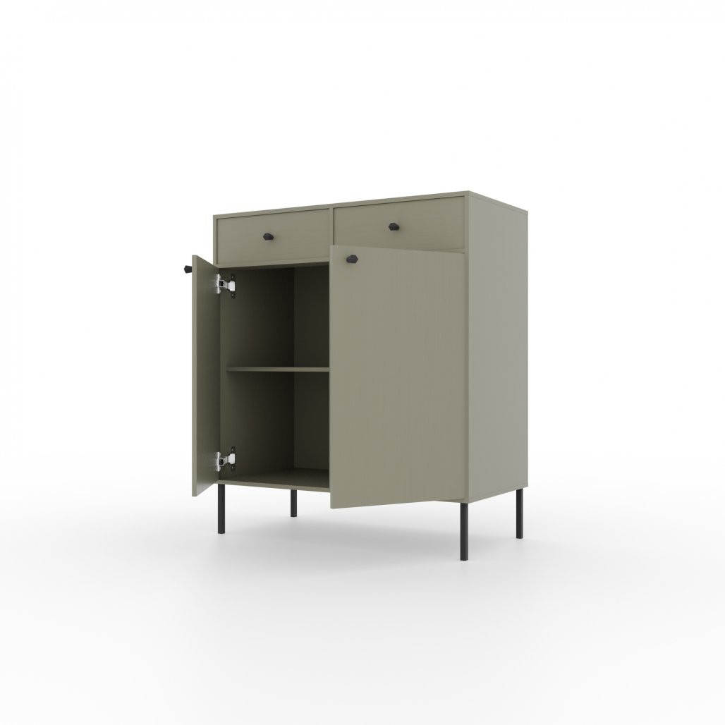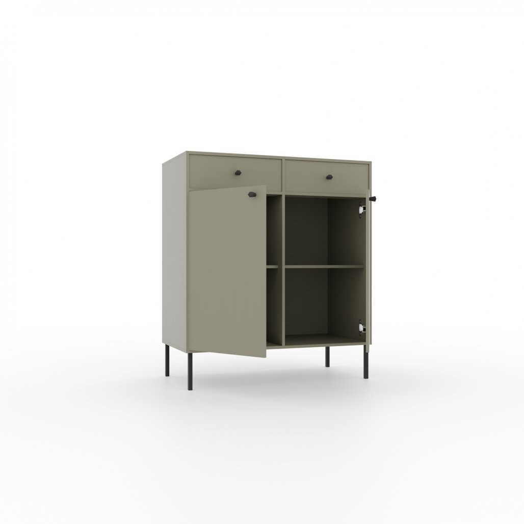 Komoda Tili z 2 vrati in 2 predaloma je sodobna in elegantna rešitev za shranjevanje, ki se popolnoma prilega tako spalnicam kot dnevnim sobam. Njena premišljena zasnova in barvna paleta omogočata enostavno vključitev v različne stile notranje opreme.