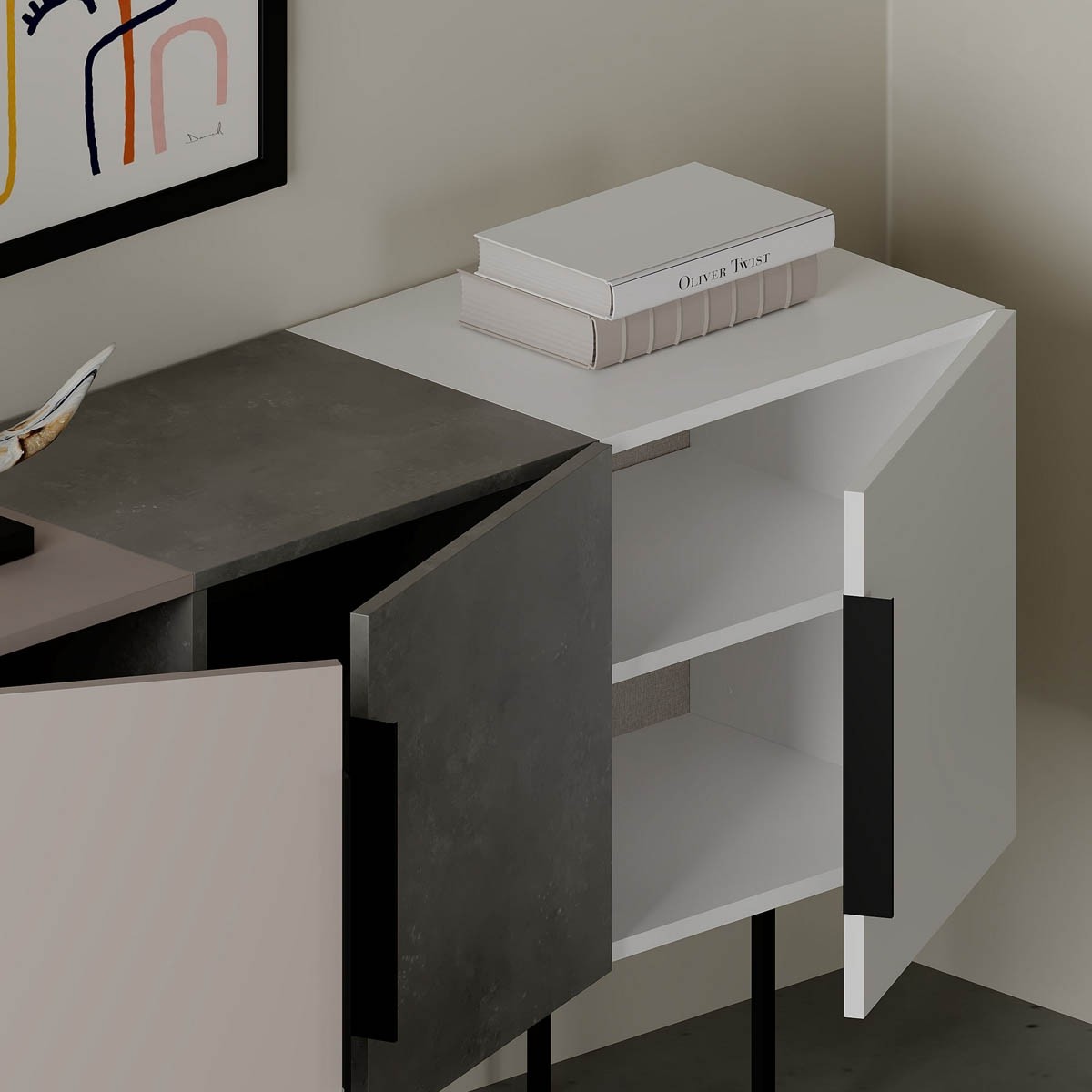 Komoda TONTINI je modernega izgleda in je zasnovana tako, da je dvignjena od tal, kar pomeni, da je enostavna za čiščenje pod njo. To je zelo koristno, saj se prah in umazanija lahko nabirata na tleh in otežujeta vzdrževanje čistoče. Poleg tega pa nudi troje vrat za katera lahko pospravite veliko reči, ki vam trenutno delajo nered v prostoru.