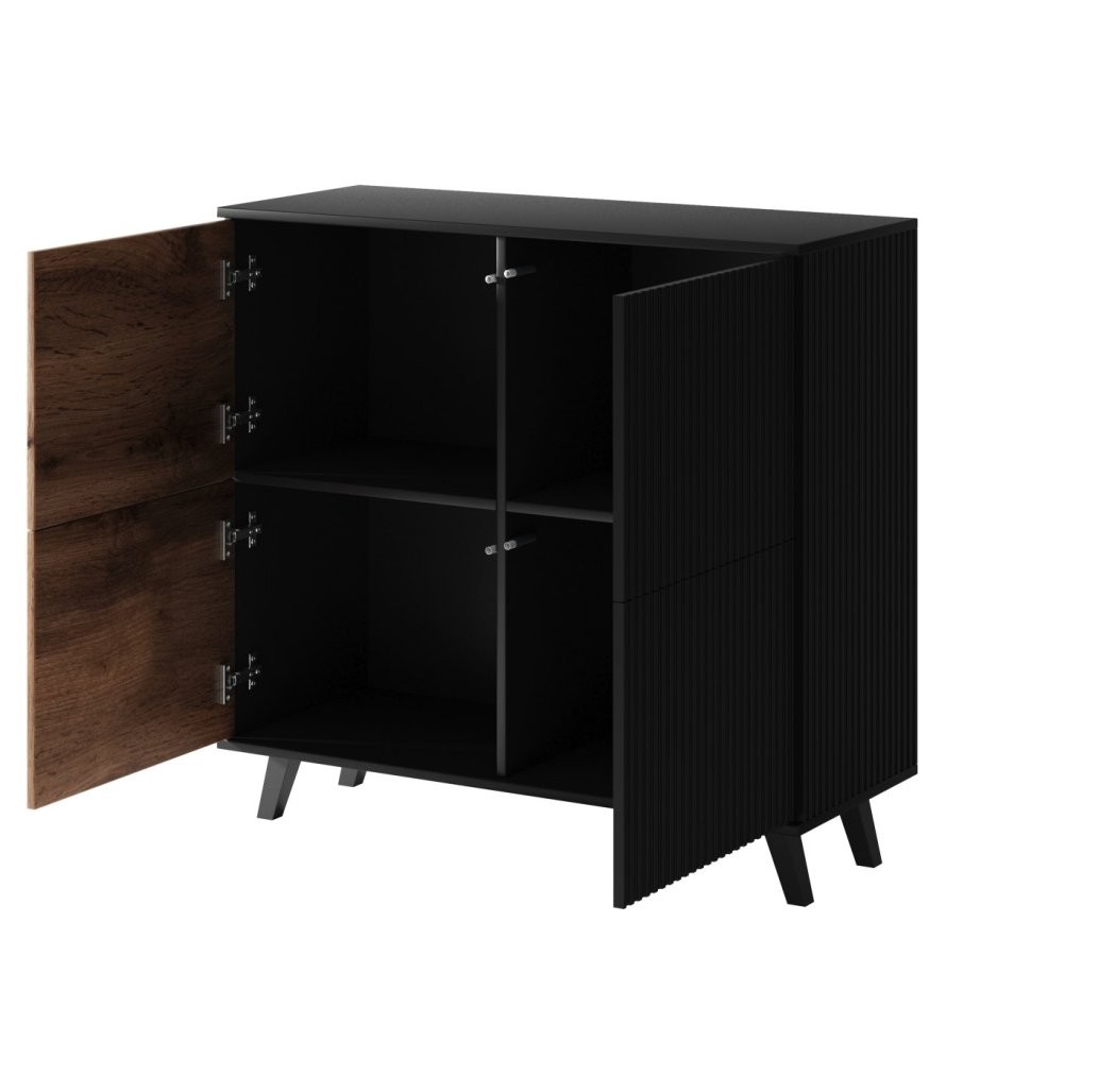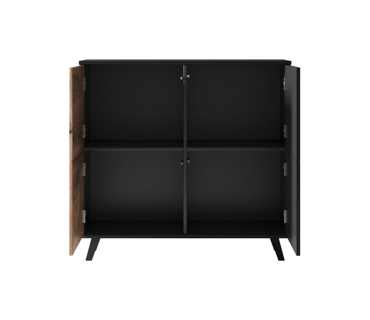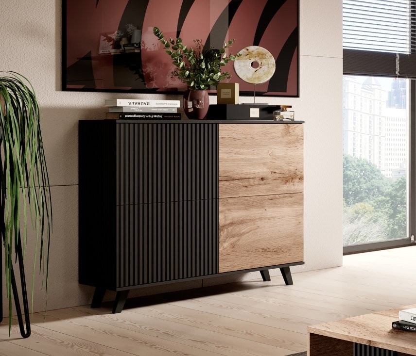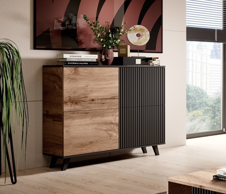 Komoda Torvak v elegantnem modernem slogu s kombinacijo hrastovega lesa in črnih poudarkov je odlična za vsak prostor. Ponuja veliko prostora za shranjevanje in organizacijo vaših stvari.