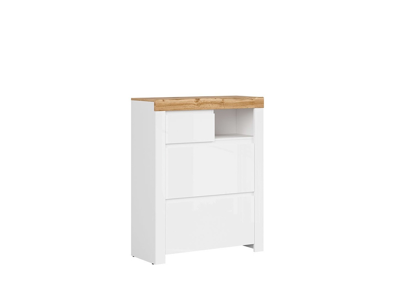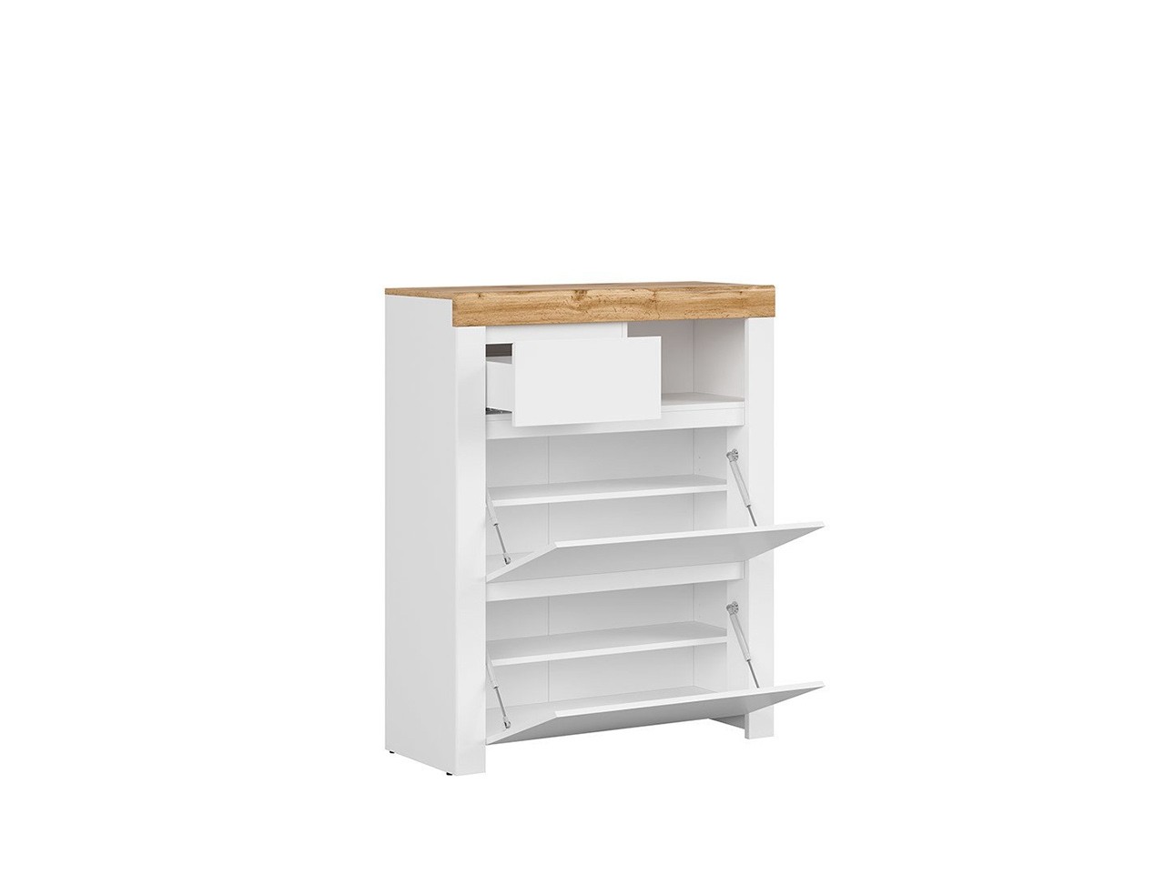 Komodo za čevlje NOEL lahko uporabite na hodniku ali v predsobi za shranjevanje vaših najljubših čevljev. V priročen predal lahko shranite kape in rokavice, na odprto poličko pa lahko odložite ključe in pošto. Vsi predali imajo funkcijo tihega zapiranja, ki pripomore k lažji vsakodnevni uporabi ter preprečuje nastajanje prask in poškodb. Komoda je na voljo v moderni barvni kombinaciji hrasta in bele barve, ki se lepo poda v vsak dom ter ga posvetli in optično poveča!