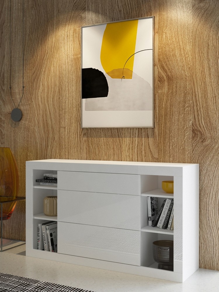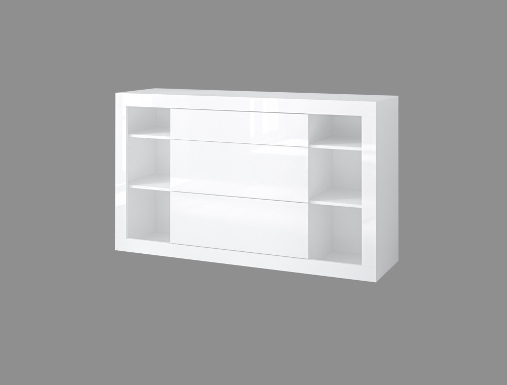 Komoda ZENA je modernega izgleda in stilsko dovršena. Komoda nudi prostor kamor lahko shranite vaše knjige, družabne igre ali pa postavite spominke na odlagalne površine, ki bodo lepo okrasili vaš dnevni prostor. Vsebuje dvoja spustna vratca in predal. Na voljo je v beli barvi visokega sijaja.