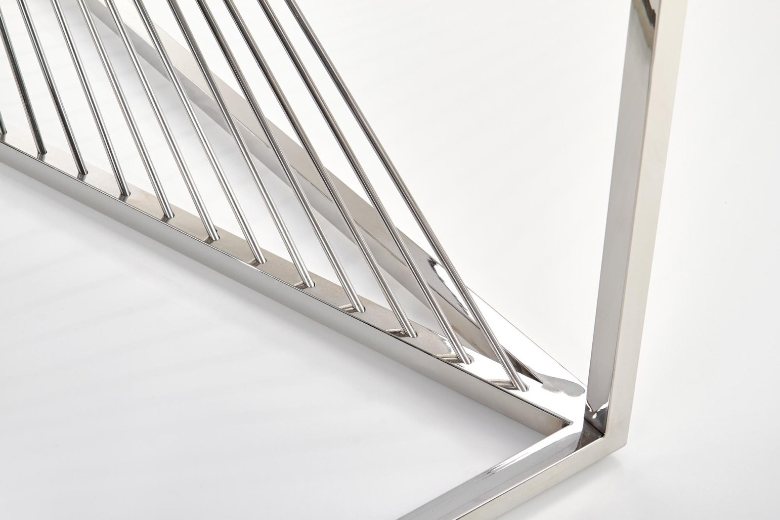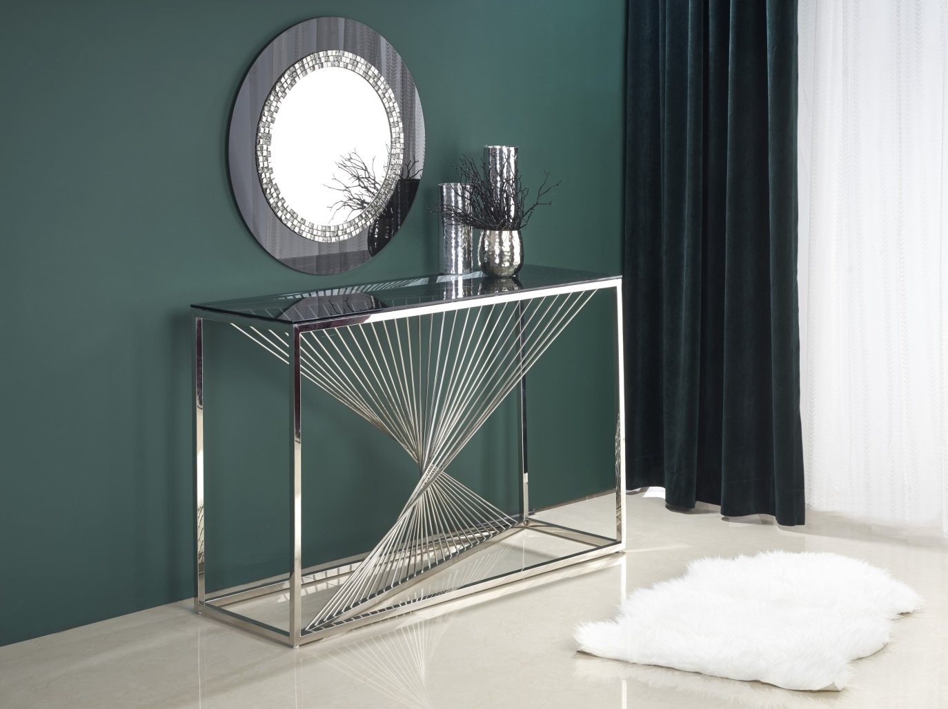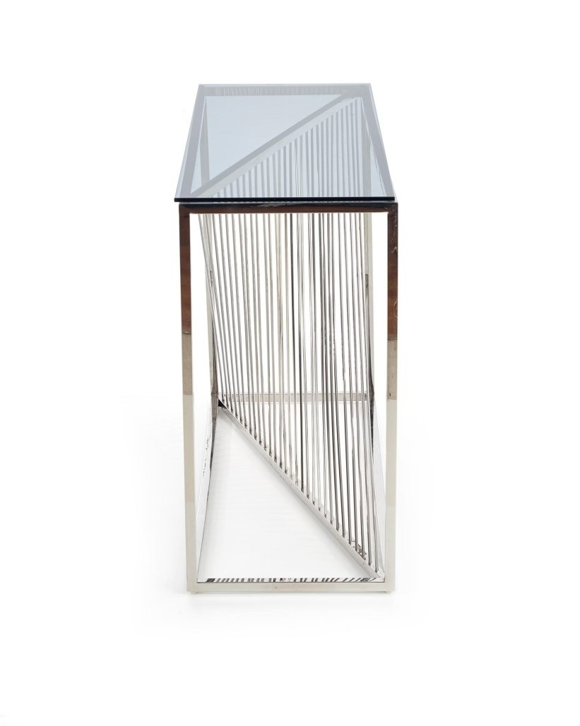 Konzolna miza Dern s stekleno površino v dimljenem videzu in kromiranim kovinskim ogrodjem. Eleganten dodatek, ki prinaša prefinjen slog v vsak prostor.