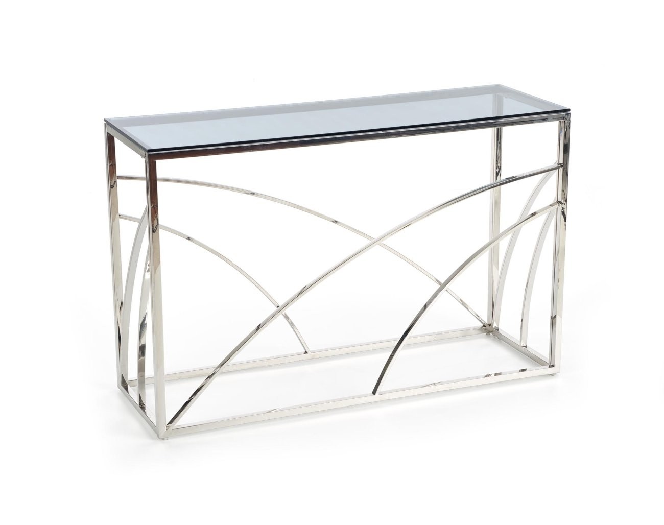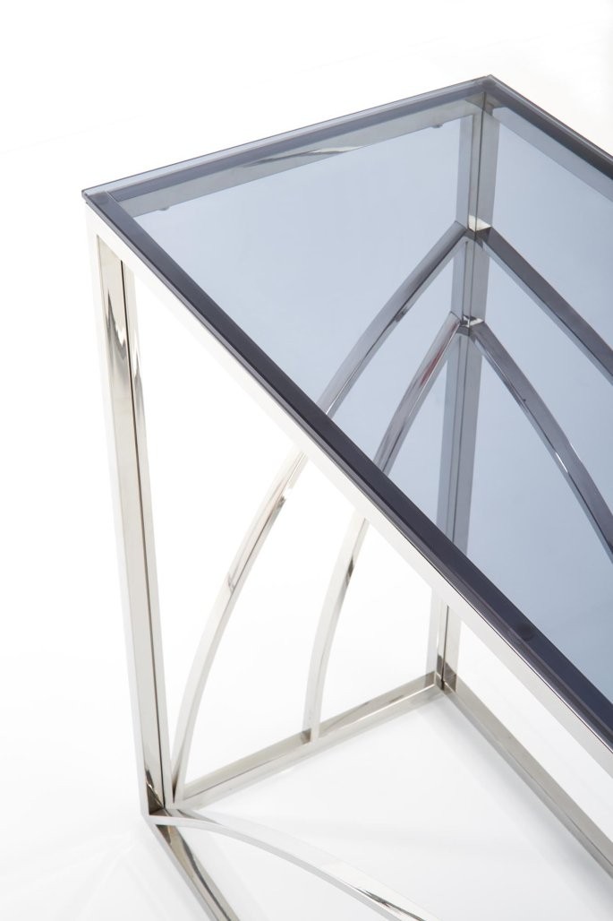 Konzolna miza Glan z dimljenim steklom in kovinskimi nogami v srebrni barvi. Dodaja pridih prestižnosti in elegance v hodnike ali dnevne prostore.