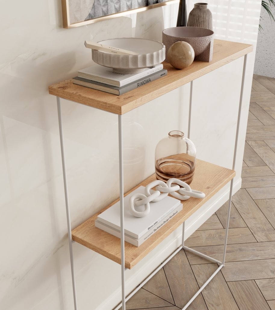 Ta konzolna miza je idealna za razstavljanje dekorativnih predmetov ali kot praktična odlagalna površina v hodniku, dnevni sobi ali spalnici.