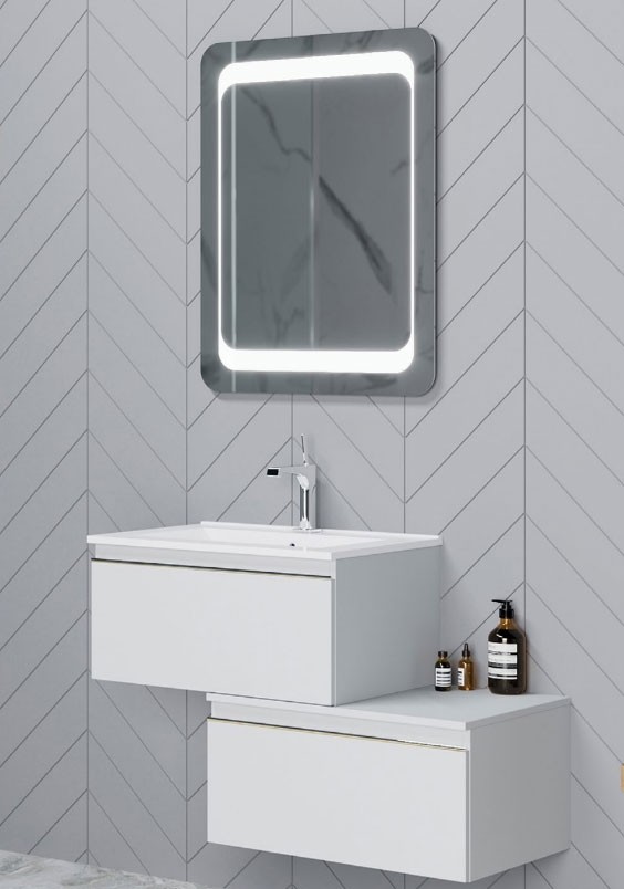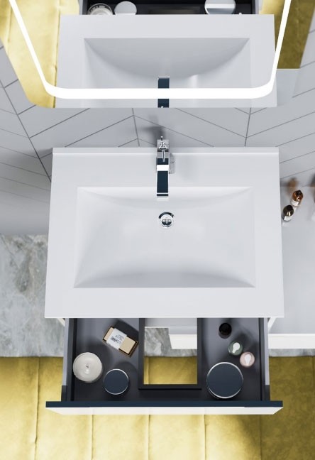 Privlačen in praktičen kopalniški blok ALBATROS nudi veliko shranjevalnega prostora za vašo kozmetiko, šampone ali pa brisače. Kopalniški blok vsebuje omarico s predalom, omarico s predalom in umivalnikom in pa ogledalo. Na voljo je v biserno sivi barvi. LED osvetlitev je vključena v ceno.
