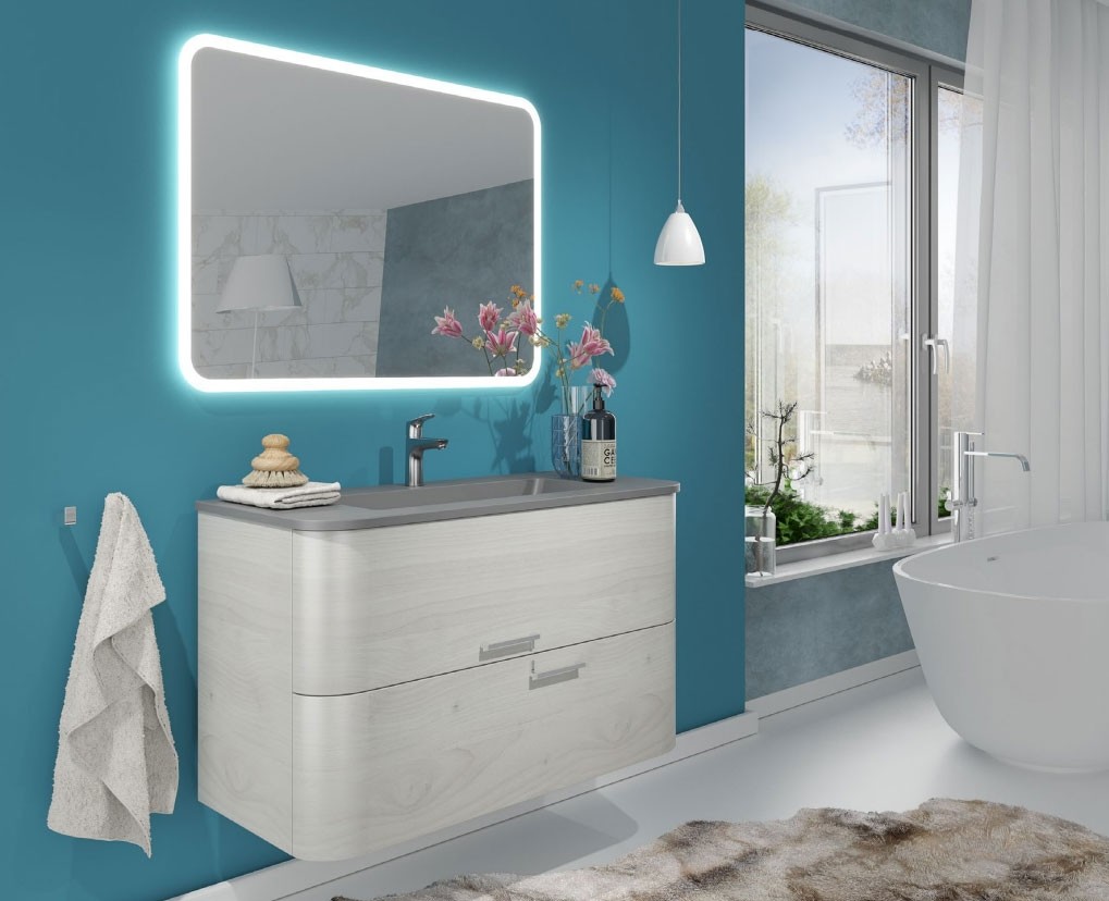 Moderen in privlačen kopalniški blok GEOS je na voljo v kombinaciji nordijskega lesa in sive barve, ki se odlično poda v vsako kopalnico. Kopalniški blok vsebuje omarico, umivalnik in ogledalo, ki omogoča urejen videz. LED osvetlitev je vključena v ceno.